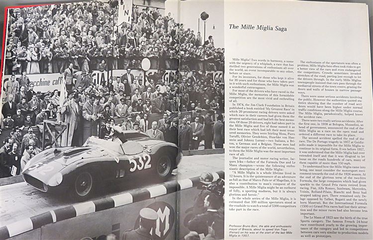 St Mary's Books is proud to present the 1981 English Language Edition of "Mille Miglia 1927-1957: The fabulous story of the great road race". Beneath the stunning dustjacket featuring a full colour photograph of the race, this hardback book is bound in a vibrant crimson mock leather with gold gilt lettering to its spine and cover. Inside, past the free endpapers which feature a black and white photograph of the race, this book has 207 pages of text, supplemented by stunning black and white images, maps, and tables throughout the book, telling the story of the celebrated Italian Thousand Mile Race. This book is in very good condition, other than some slight sun damage to the dustjacket, there are few other notable imperfections to the dustjacket or the book itself, which appears almost unread. This book is looking for a new home, and would make for a perfect gift.