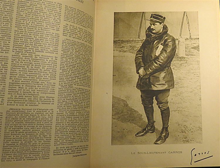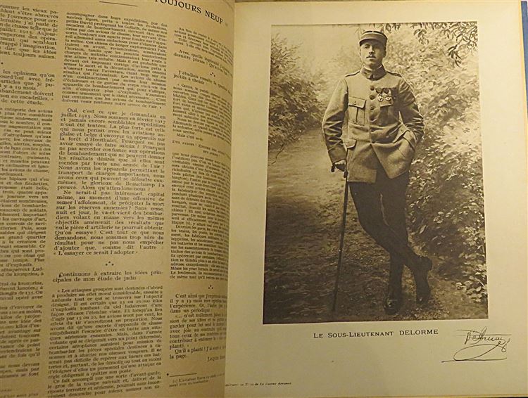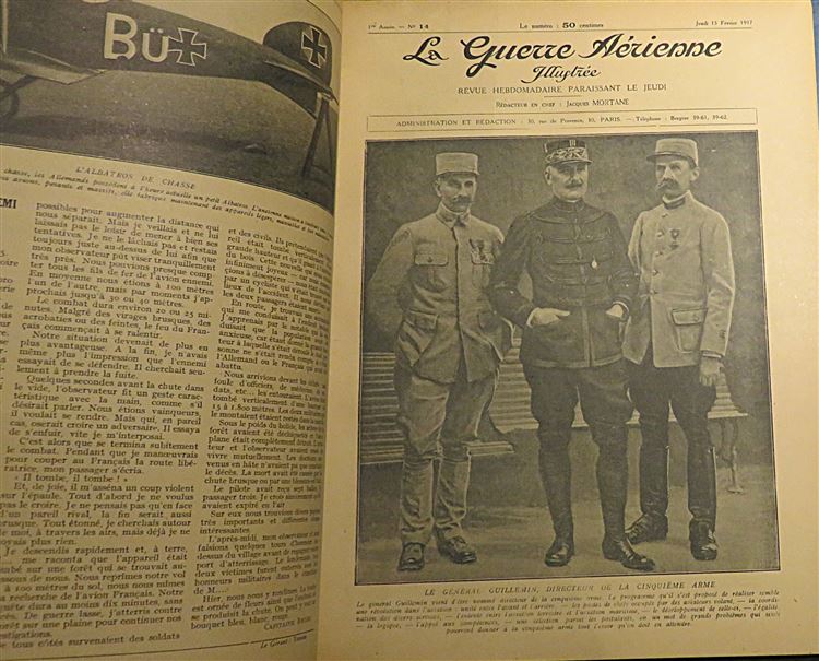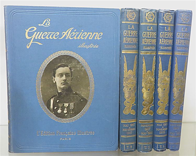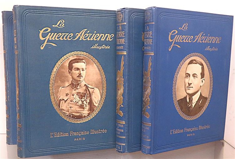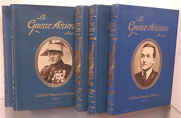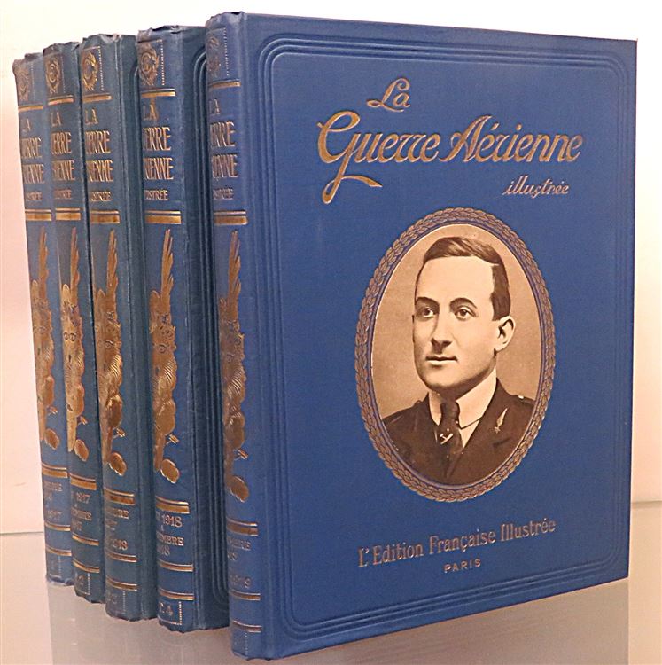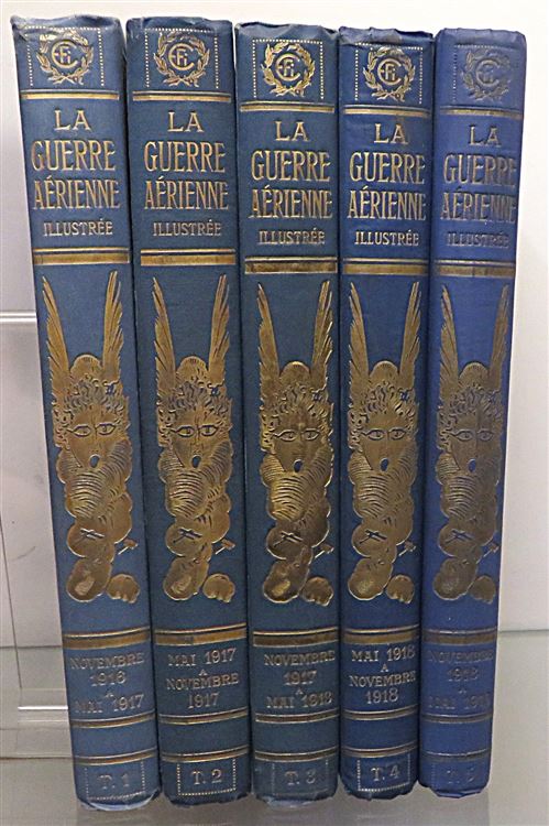 A handsome five volume bound set of La Guerre Aerienne fully illustrated throughout. Bound in blue cloth with paper pictorial onlay and gilt titles to the front. Gilt ttiles and decoration to the spines. The binding is in very good condition despite a little fading and surface wear. Internally the pages are toned although very clean throughout. The text is in french and triple columned. Decorative endpapers with the text block's still fairly tight. A fascinating glimpse into the lives of the French air force during World War One. Originally published as a weekly magazine shortly after World War One, providing a factual chronicle and celebration of French military aviation and its aces. This set is heavy and may require extra shipping.