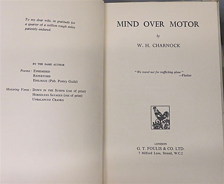 This lovely edition of "Mind over Motor" by motoring poet W. H. Charnock is now in the possession of St Mary's Books. Bound in bright yellow cloth with green ink lettering to the spine, this hardback book is encased in its original lime green dustjacket. Inside, one finds 116 pages of text, supplemented by black and white photographs, detailing personal stories and accounts from Charnock's life and experiences with motor cars. This book is in good condition, other than some minor foxing the interior remains clean and readable. The dustjacket, on the other hand, is worn and held together by tape, and thus can only be described as fair. This book is looking for a new home, and would make for a lovely gift.