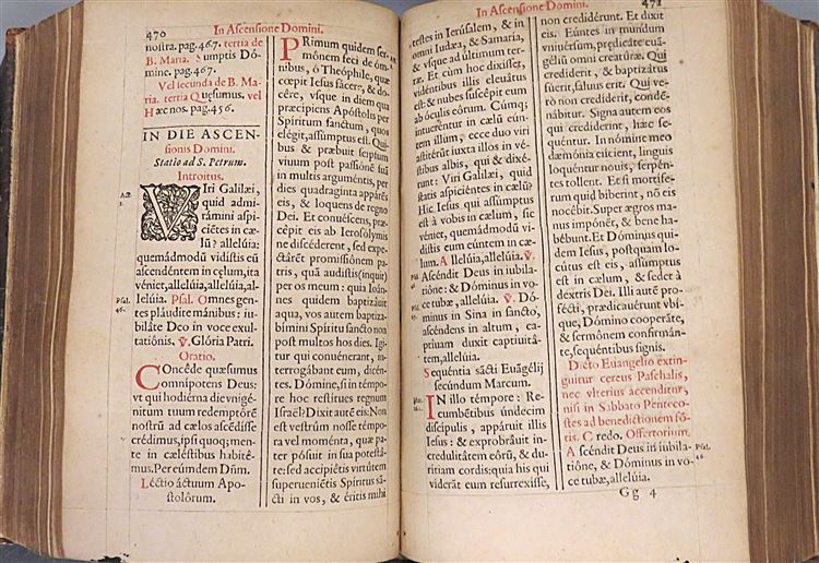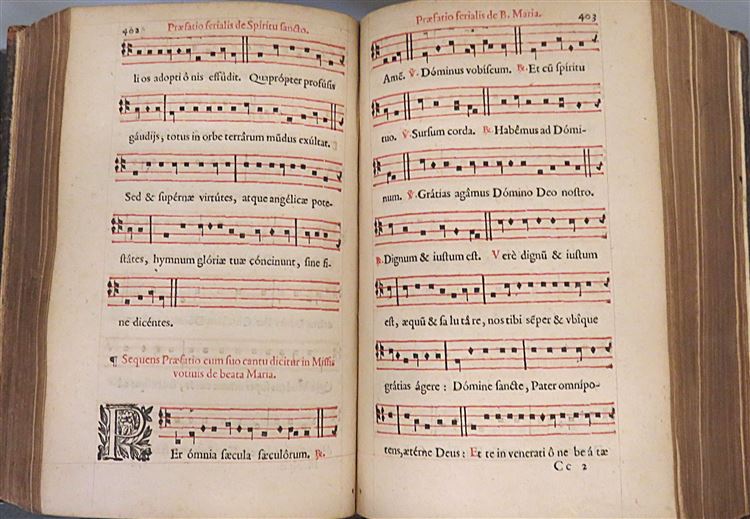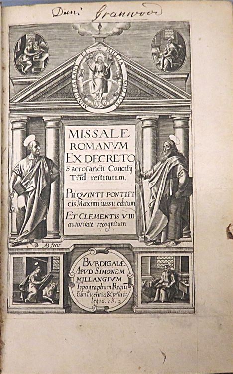St Mary's Books is proud to present this stunning 1612 edition of "Missale Romanum Ex Decreto Sacrosancti Concily Trid restitutum", bound in a later leather binding. This hardback book features all edge gilt and gilt lettering and decorations to the spine and boards. Inside, one finds a bookplate indicating that this edition once belonged to William Cecil Chambers. Beyond this is a stunning title page featuring a black ink illustration of saints and prophets outside an ornate building in the style of classical architecture. Throughout this book, there is a playful mixture of red and black ink, stunning black ink illuminated initials, and interestingly, sheet music for various hymns throughout the book. This amazing window into history is in fair to good condition, there is some wearing to the cover and spine, the front board is threatening to lift, and there are several inscriptions to the free endpapers. However, remarkably, the text of this over-400 year old book is very clean and readable. This amazing book is looking for a new home, and would make for a perfect gift for any collectors.