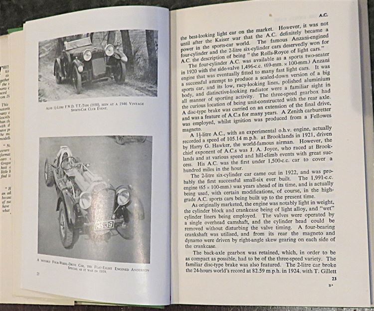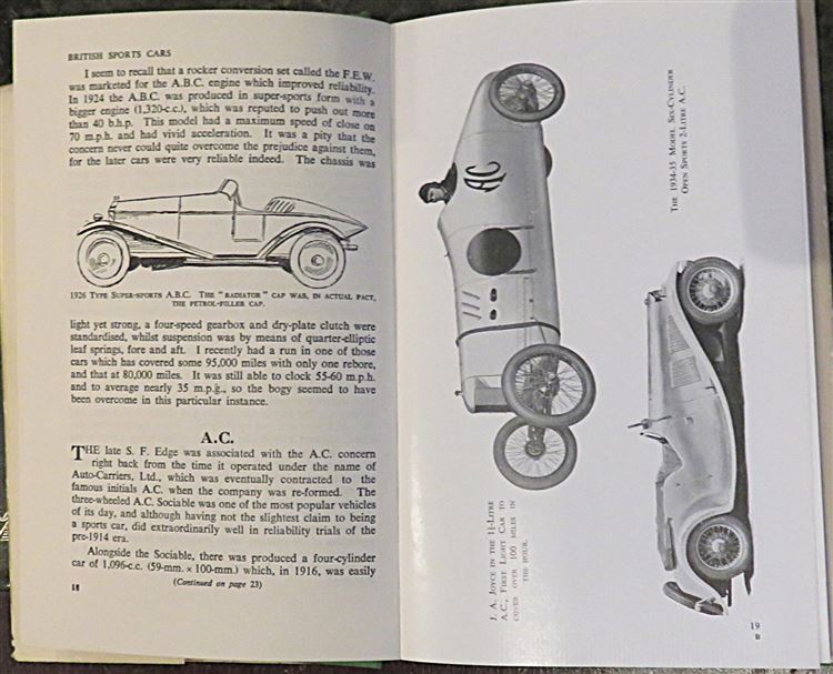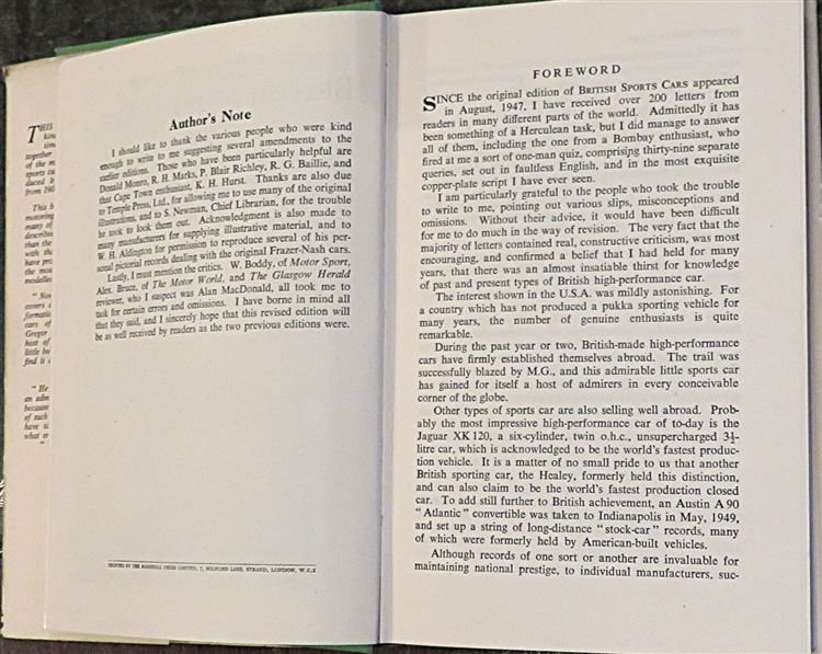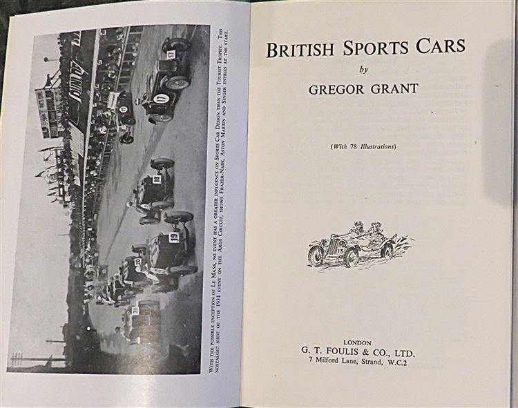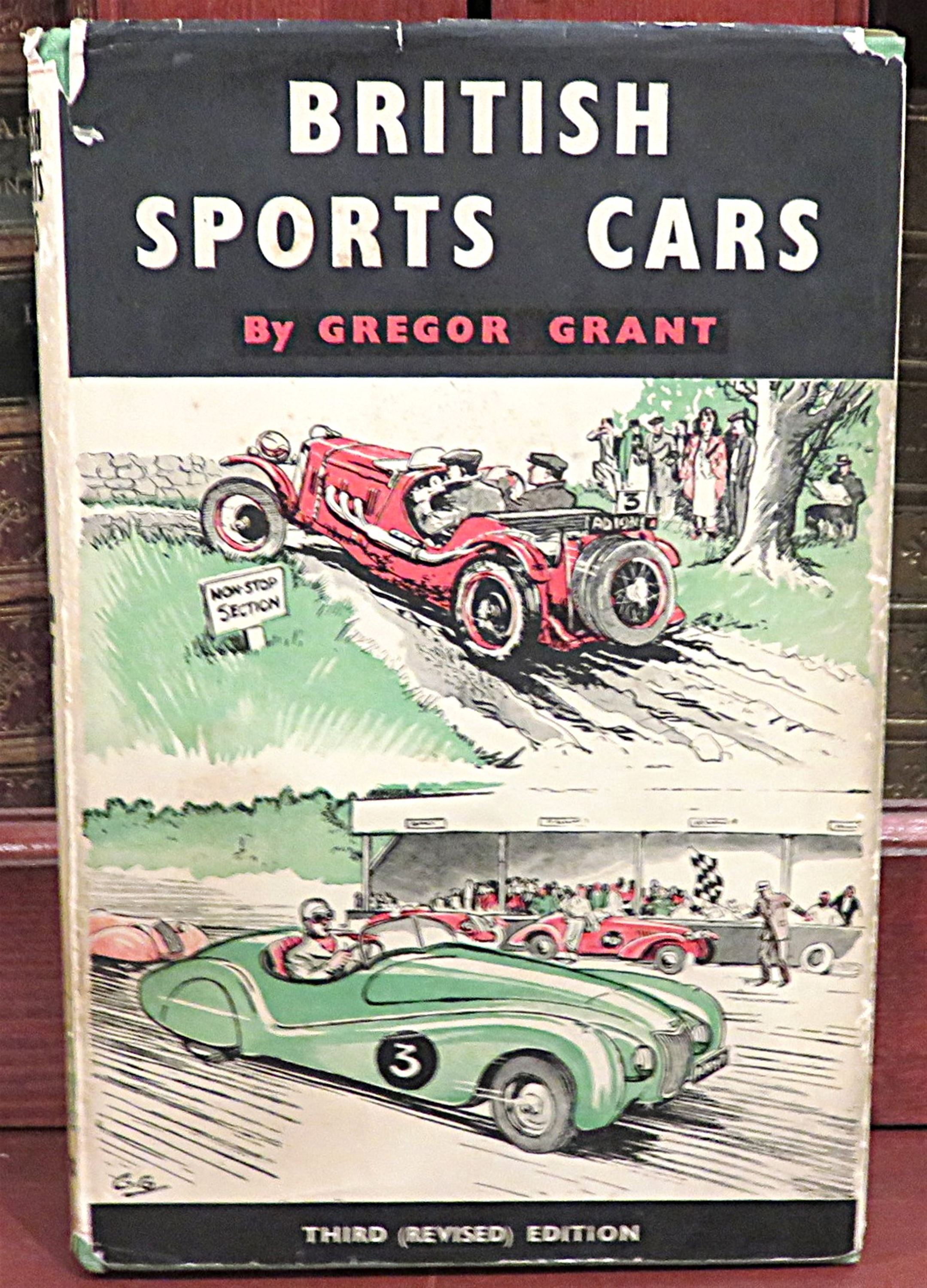 This lovely hardback edition of "British Sports Cars" by Gregor Grant is housed in its original dustjacket featuring charming red, black and green ink illustrations of motor races. Bound in a lovely lime green cloth with gold gilt lettering to the spine, this book has 220 pages of text peppered with black ink illustrations and black and white photographs of British sports cars. This charming catalogue of the 96 British Sports Cars produced up until 1950 is in good condition, though the dustjacket is worn at the corners and thus can only be described as fair, the book itself is clean and readable with few notable imperfections. This book is looking for a new home, and would make for a lovely gift for any vintage motoring enthusiast.