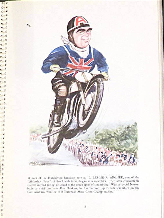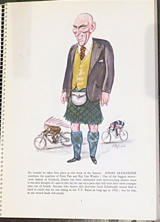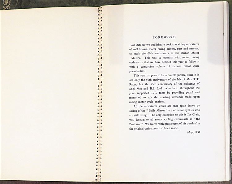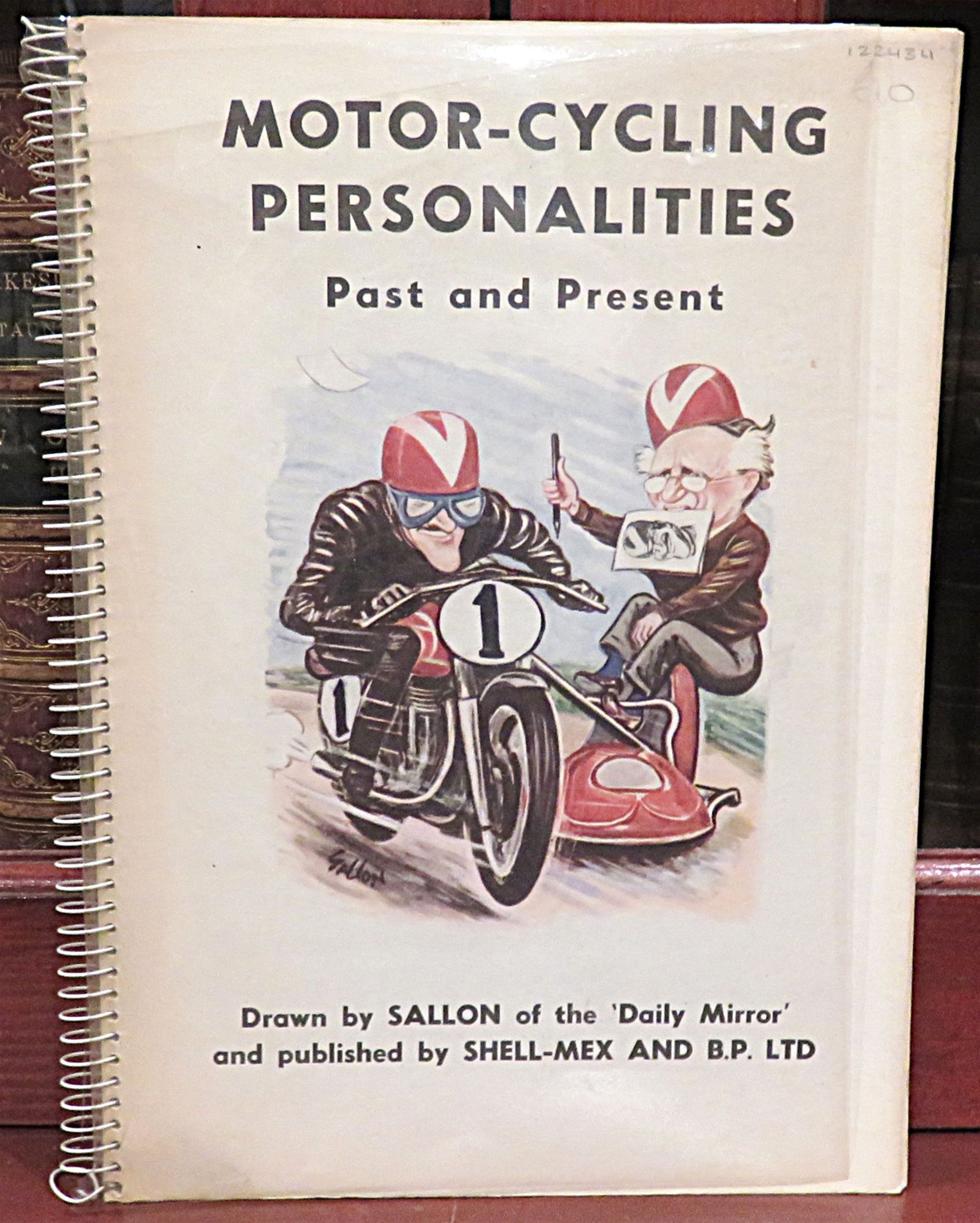 This lovely edition of "Motor-Cycling Personalities Past and Present", featuring charming full colour illustrations by "Sallon" of the Daily Mirror, is now in the possession of St Mary's Books. This paperback book, bound with plastic rings, has 54 pages with 54 illustrations of notable motor-cycling personalities up until the year 1957. This book is in good condition, though the plastic protective pages are warped and damaged, and the covers are faded, the interior and the illustrations remain clean and bright. This book is looking for a new home, and would make for a lovely gift for any vintage motor cycle enthusiast.