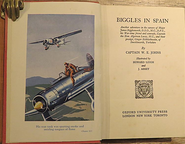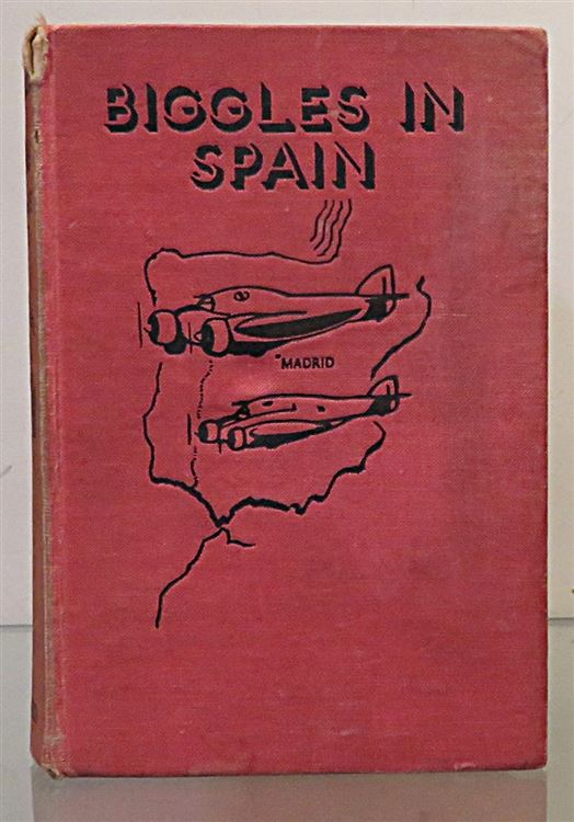 St Mary's Books is proud to present this lovely 1939 first edition of "Biggles in Spain" by Captain W. E. Johns. Bound in a lovely red cloth with red top edge staining and black ink lettering and illustrations of planes to the cover and spine, this hardback book has 256 pages of text. This exciting tale of heroism and adventure is supplemented by full-page black ink illustrations throughout the book, as well as the full-colour frontispiece, "His rear tank was spurting smoke and swirling tongues of flame". This book is in good condition - though the spine is faded and there is some bumping and signs of wear, other than a 1942 inscription on the free endpaper, the interior of the book remains clean and readable. This is a remarkably well preserved and rare copy of a classic children's book, and it would make for a lovely gift for any Biggles fans.