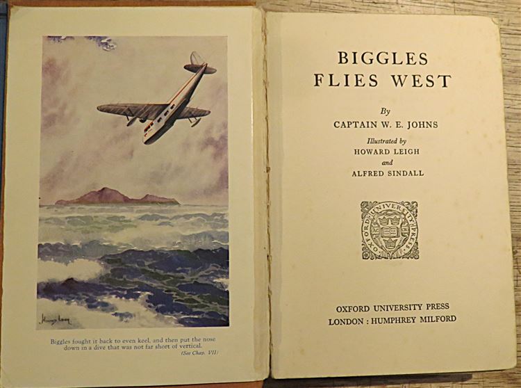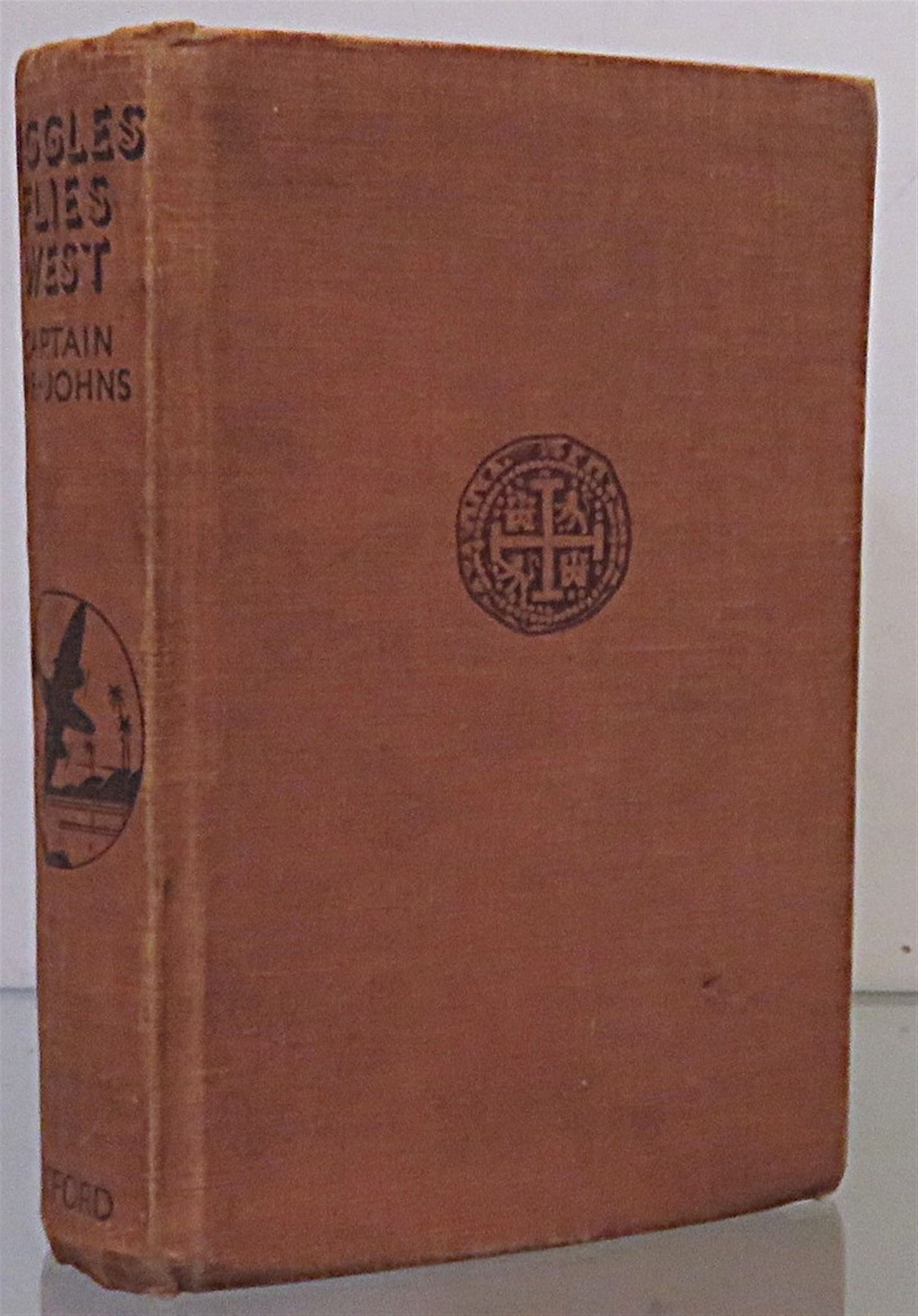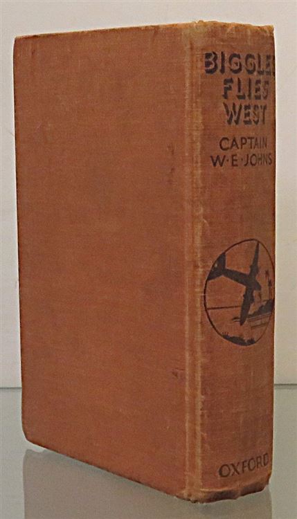 St Mary's Books is proud to present this 1937 early edition of "Biggles Flies West" by Captain W. E. Johns. Bound in a charming orange cloth with brown ink lettering and illustrations to the cover and spine, this hardback book has 255 pages of text. Inside, one finds a tale of heroism and adventure, supplemented with full-page black ink illustrations by Howard Leigh and Alfred Sindall, as well as a full-colour frontispiece, "Biggles fought it back to even keel, andthen put the nose down in a dive that was not far short of vertical". This book is in fair to good condition - the covers are bumped and worn, the spine is weak, and there is some slight foxing throughout the book. However, this item is nevertheless in a remarkable condition given its age and rarity. This book is looking for a new home, and would make for the perfect gift for any Biggles enthusiasts.