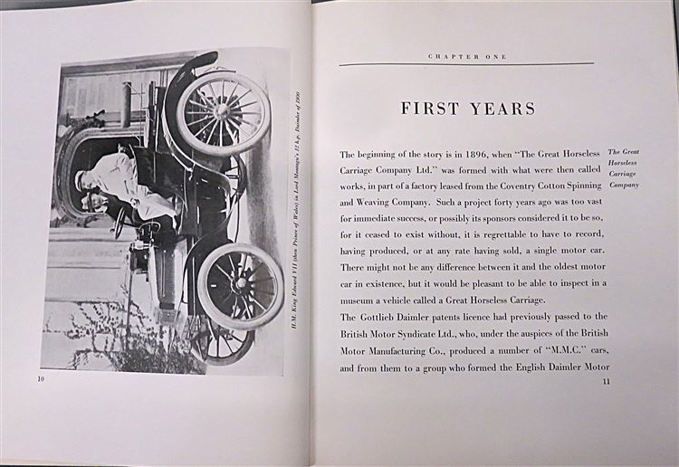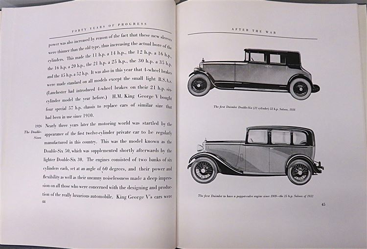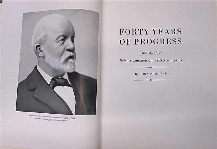 St Mary's Books is proud to present this lovely 1936 first edition of "Forty Years of Progress: The story of the Daimler, Lanchester, and B. S. A. motor cars" by John Prioleau. Bound in navy buckram with the title in white ink on a gold label, this hardback book has 60 pages of text, complete with black ink illustrations and black and white photographs, detailing the development of the modern internal combustion engine. This book is in very good condition, with few notable imperfections, it appears virtually unread. This charming book is looking for a new home, and would make for a perfect gift for any motoring enthusiast.