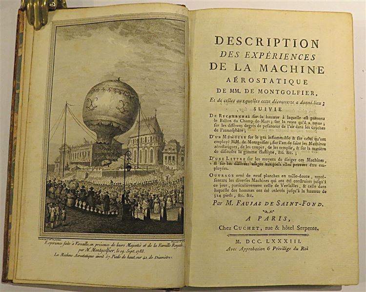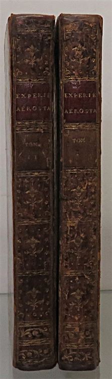 Hardback. A beautiful two volume set bound in full speckled leather with two title bands and gilt lettering and decoration to the spines. All edges are marbled with marbled endpapers. Beautifully illustrated frontispiece to both volumes with the occasional chapter vignette and several engraved plates throughout including a foldng diagram to volume one. The leather is a little worn to the extremities, as expected for its age, although presenting well. The spines are a little faded. Pencil notation to the prelims of both volumes, more so to volume one. The pages are lightly toned with the occasional spot of foxing, although generally very clean. The text blocks are tight within the binding. Volume I. pp. prelim + frontispiece + xl + 299 + 7 + 9 engraved plates, plate 5 is the frontispiece. Volume II, 5 engraved plates, including frontispiece, pp. prelim + frontispiece, + title page + 366 + errata + blank page. The first comprehensive account of balloon flight including the first flight in Versailles by the Montgolfier brothers. French Text.
