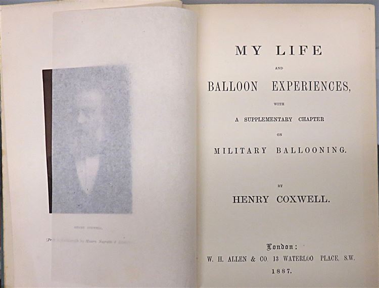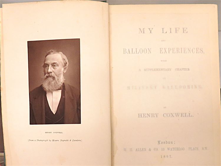 St Mary's Books is proud to present this stunning 1887 edition of "My Life and Balloon Experiences with a supplementary chapter on military ballooning" by Henry Coxwell. This hardback book is bound in a lovely turqoise cloth featuring a charming black ink and gold gilt illustration of two men in a balloon on the cover. Inside, past the grey ink leaf pattern on the free endpapers and the frontispiece photograph of Henry Coxwell, one finds 228pp. with 48 pages of contemporary advertisements to the rear. This charming book details Coxwell's experiences from his boyhood fascination to aviation to his life as a pioneering victorian balloonist.This edition is in very good condition, though the covers are slightly bumped and there is an ex-libris paste down and some offsetting on the front free endpapers - this remains a clean and readable copy with few other notable imperfections, remarkable for a book of this age. This stunning book is looking for a new home and would make for a perfect gift for any ballooning enthusiast.
