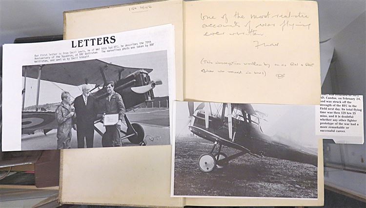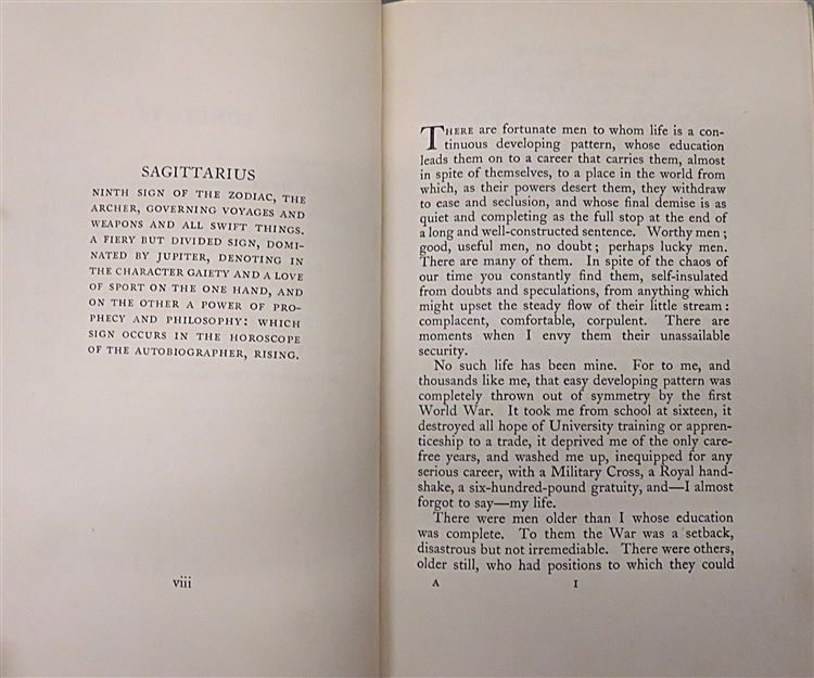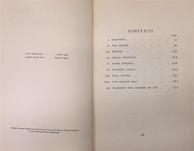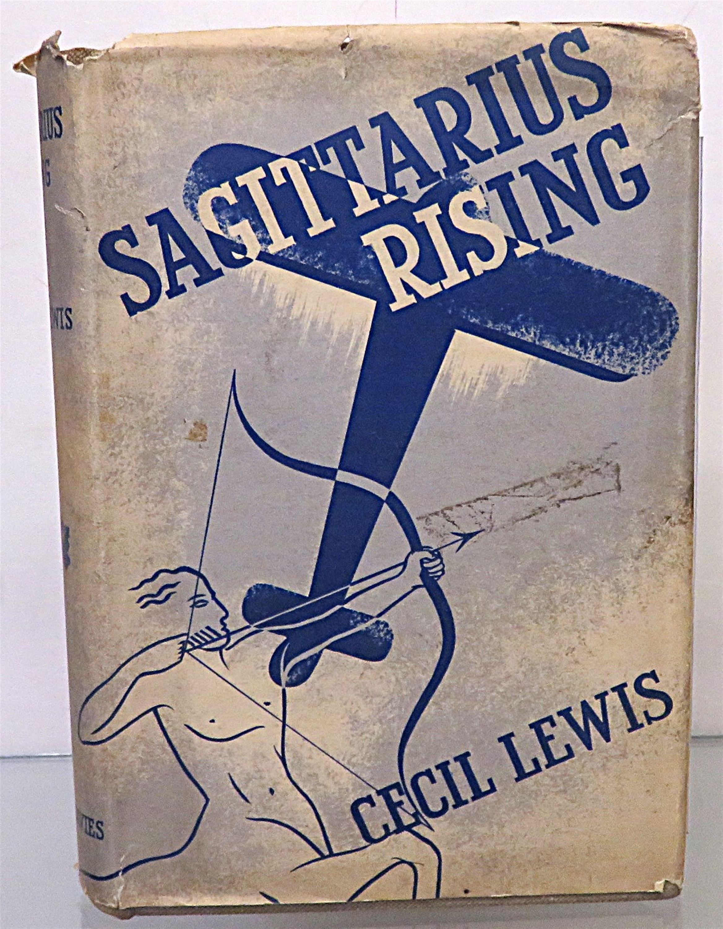 St Mary's Books is proud to present this 1936 second impression of Cecil Lewis' "Sagittarius Rising", housed in its original blue and white dustjacket featuring an illustration of a plane and "the archer". Bound in cream cloth with blue ink lettering to the spine, this hardback book has 331 pages of text, detailing Lewis' adventures and experiences as a pilot in the Great War. This copy is complete with a printed letter from Cecil Lewis, as well as a newspaper clipping, containing a black and white photograph of Lewis standing next to his plane. This edition is in very good condition - though the dustjacket is torn and bumped and thus can only be described as "fair to good", the book itself remains clean and readable, remarkable considering the age and rarity of this copy. This is a stunning edition of one of the most famous works of literature to arise from the Great War, and it is now looking for a new home.