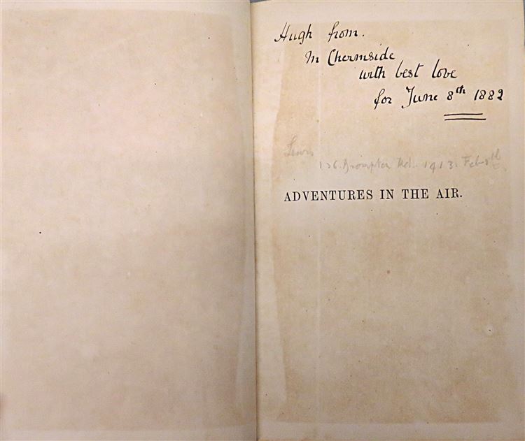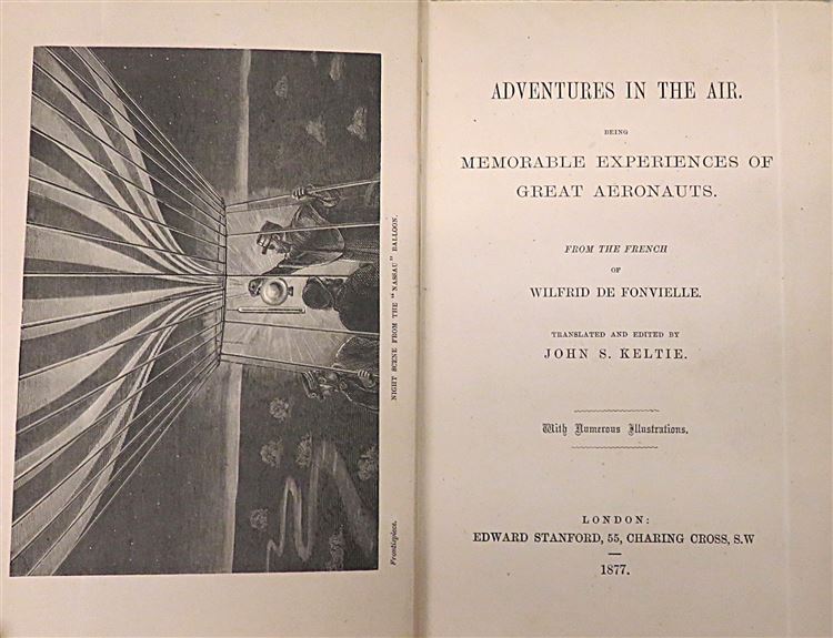 This lovely 1877 first edition of John S. Keltie's "Adventures in the Air. Being Memorable Experiences of Great Aeronauts", a translated and revised edition of Wilfrid de Fonvielle's french language work, "Aventures Aeriennes", is now in the possession of St Mary's Books. Bound in a rich green cloth wiht black ink and gold gilt illustrations of clouds and balloons on the cover and spine, this hardback book has i-xvi, 304pp., and 32 pages of contemporary advertisements to the rear. Peppered with 35 full page black ink illustrations, including the stunning frontispiece, "Night Scene from the "Nassau" Balloon", this book relays the exciting adventures of numerous pioneering aeronauts. This book is in very good condition, though the covers are slightly bumped, there is some offsetting and an inscription to the prelims and some splitting on the hinges, the book is otherwise remarkably clean and readable given its age and rarity, and would be the perfect addition to any collection.