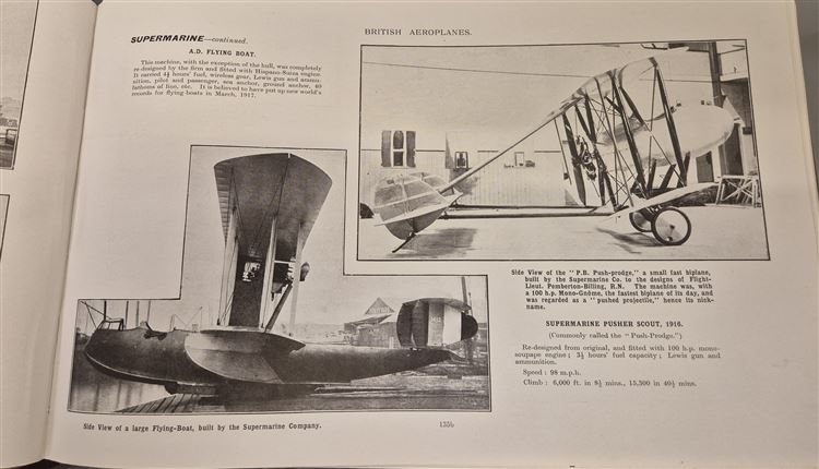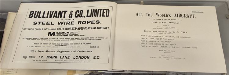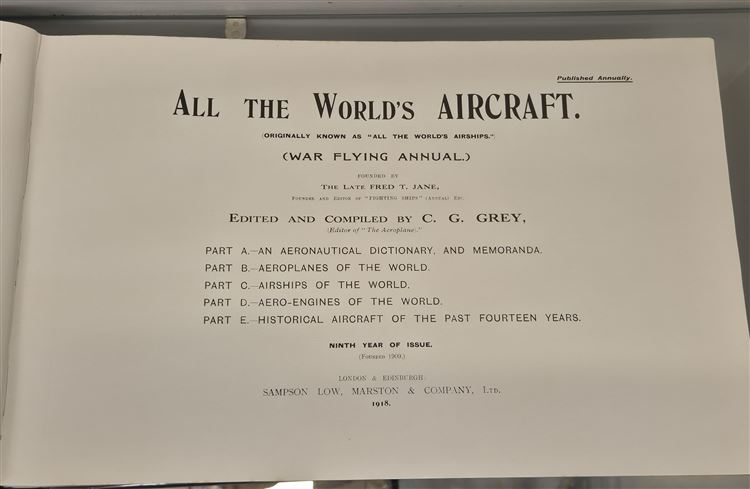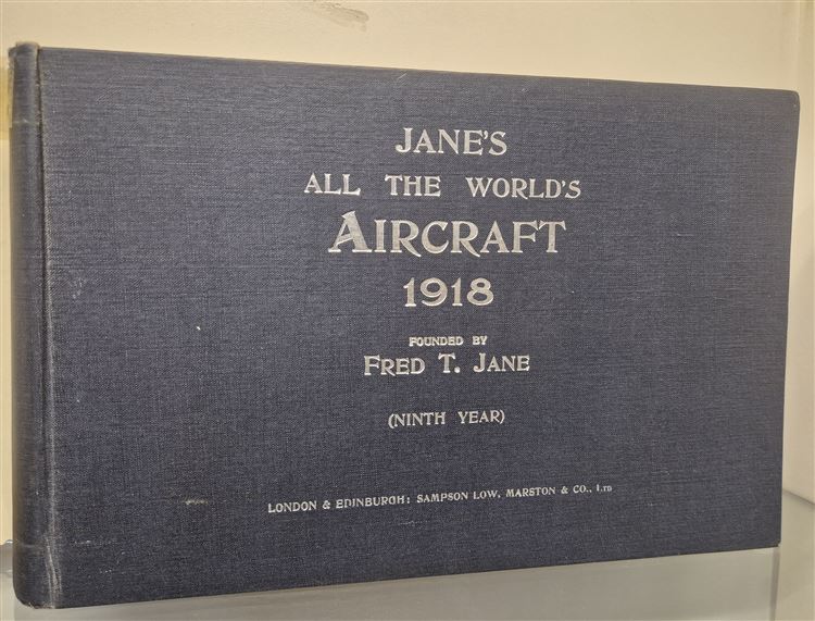 This being the original all the world's aircraft with the original dustjacket, most unusual to find, this fabulous record of all of the aircraft around the world from each country, with detailed statistics for each plane and images with data on each, a large number of advert to the early pages, all of which are period, this copy bound in the usual blue cloth binding, showcases plans of the 1918 period (WWI) and so this particular volume is very useful. A very good clean copy with an inscription "Christmas 1918" This part of a large fun of early Jane’s Aircraft.