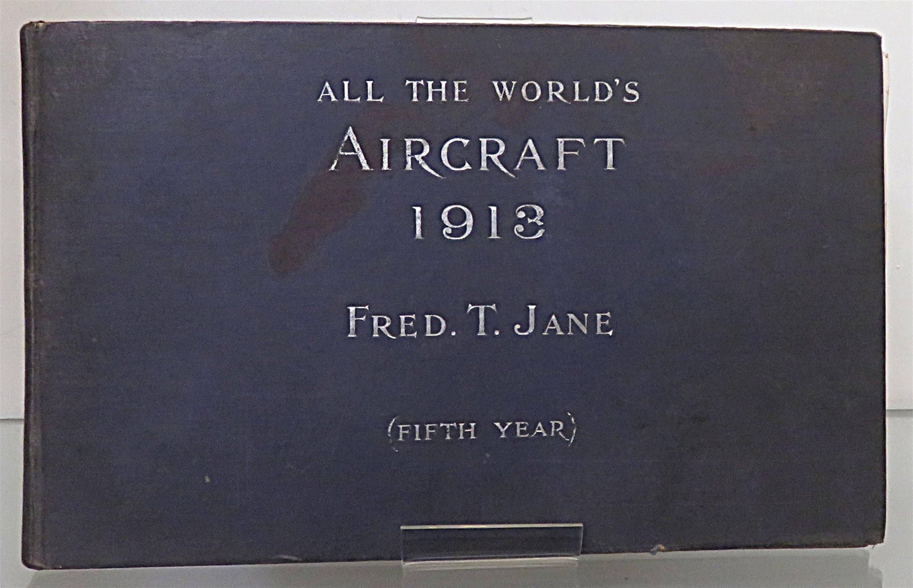 Hardback. Being the Fifth year of Publication of this iconic aviation title founded and edited by Fred T. Jane, this one published in 1913. Part A. Aeroplanes And Dirigibles Of The World. Part B.. Historical Aeroplanes Of The Last Six years. Part C. The World's Aerial Engines. Part D. Aerial Who's Who" And Directory. Handsomely bound in navy cloth with titles in silver to the front and spine. Adverts to the prelims and to the rear. All Aeroplanes and Dirigibles of the time are listed alphabetically and via Country of Origin with an image or diagram for each. The cloth displays some discolouration with a little edge wear. Internally the binding is a little loose with cracking to the hinges, page iv loose. There is a little edge wear to a few of the pages with a piece missing along the base of page 13. Minor discolouration to the endpapers otherwise a nice clean copy. pp. xv + 220 + 28d. Overall a scarce copy of a fascinating book.