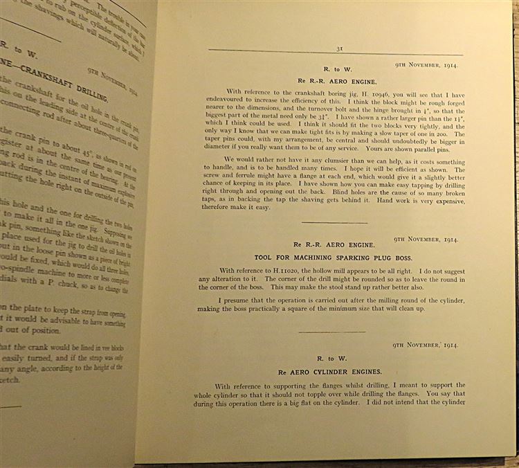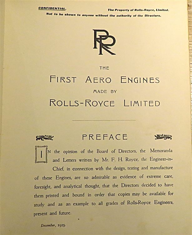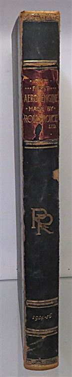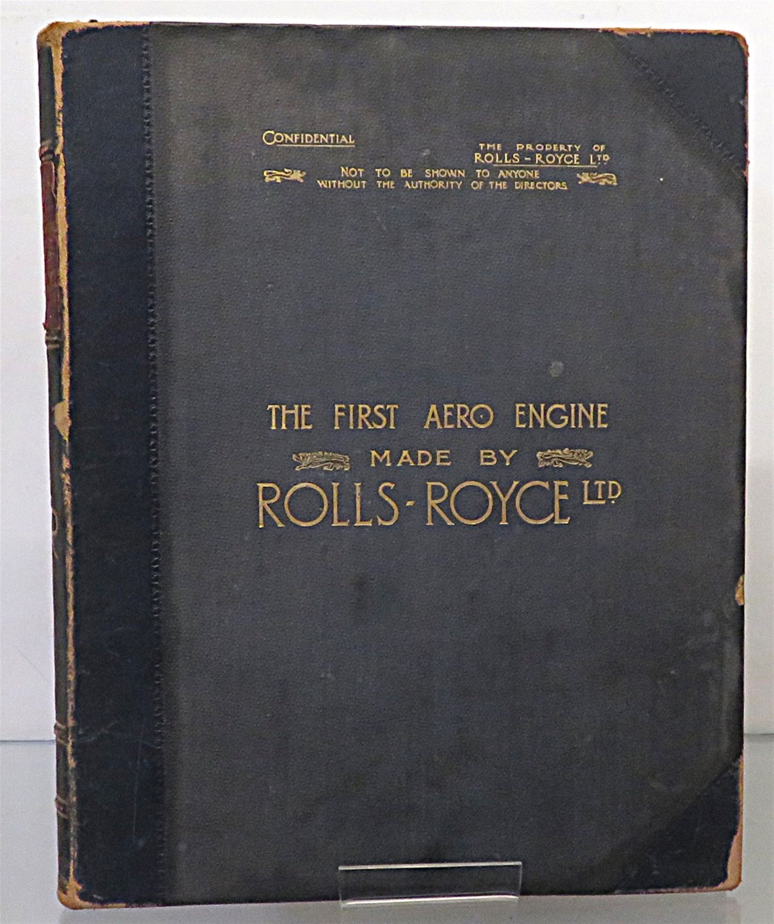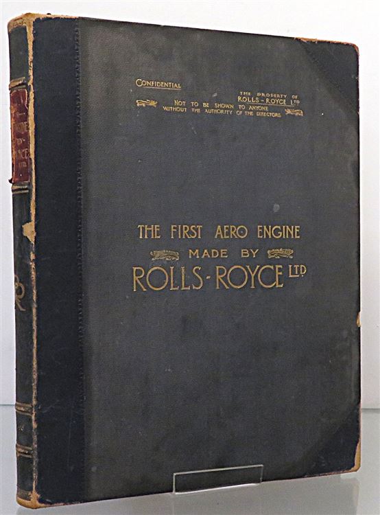 Hardback. A fascinating book on the Rolls-Royce Aero Engine, developed in 1915 at the request of the British Admiralty wanting a more powerful engine, with Sir Henry Royce designing the V-12 liquid fuelled engine. Developed for World War I requirements, with the first test run in February 1915. Known as The Rolls Royce Bible this book contains memoranda and letters written by Mr. F.H. Royce the engineeer in chief, in connection with the design and manufacture of these engines. It is lacking one leaf pp.199/200 as in all known copies, presumably removed as a result of a memo unfairly criticising a tool design. The book consists of an almost daily series of memos sent from F.H. Royce home in Kent to the works in Derby from 19th August 1914 to 4th March 1916. Mostly concerning conception and design of the V-2 Eagle Aero Engine. The number of copies produced is not known but it is thought to be few. Bound in original blue morocco with cloth sides and gilt lettering to the front and spine. The binding is a little rubbed and worn however still presents well. The pages are clean and the binding is firm. A remarkable, unique copy.