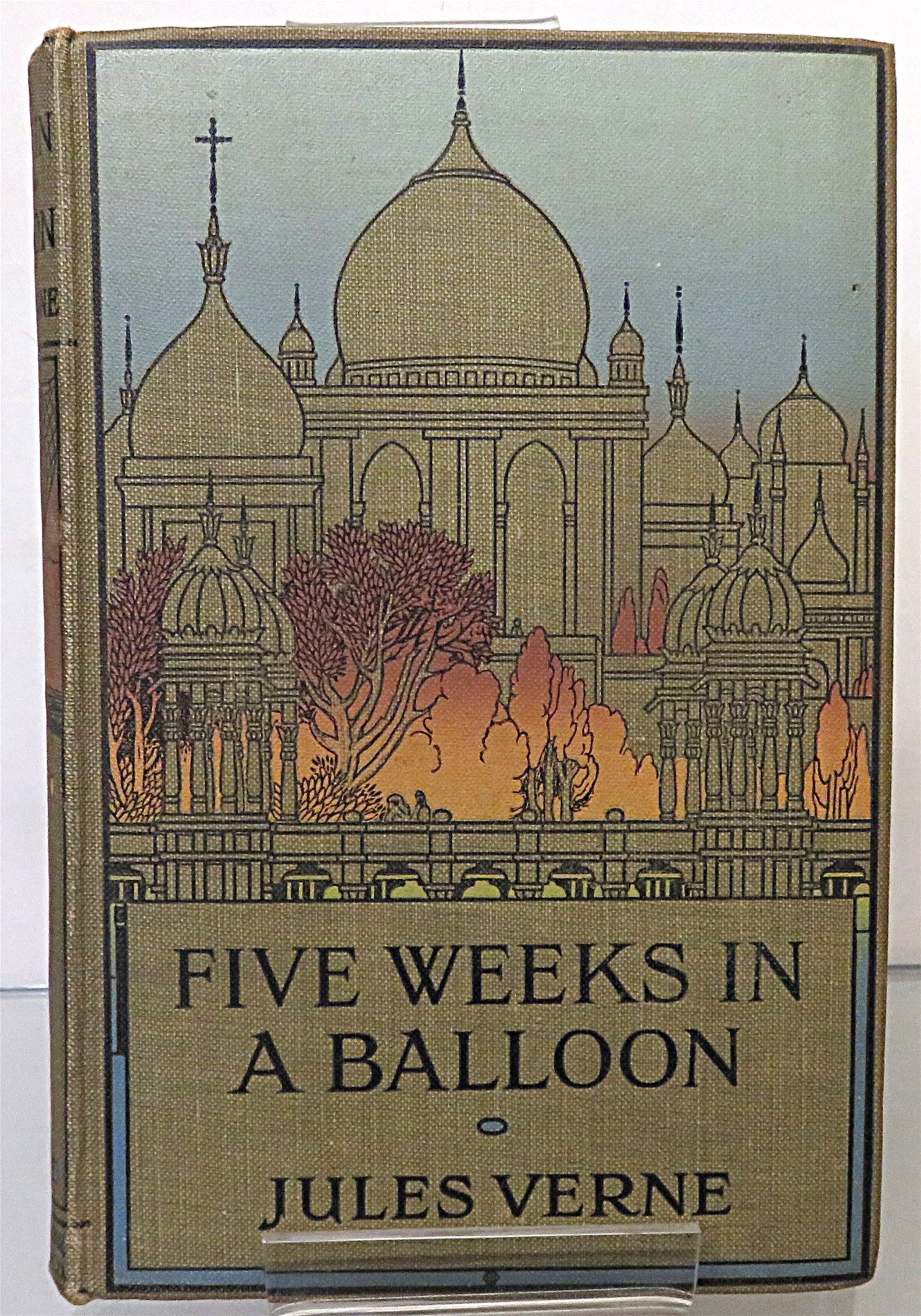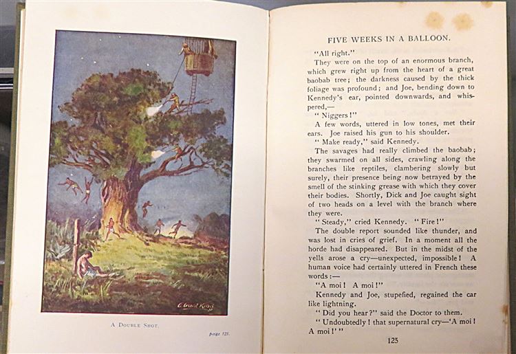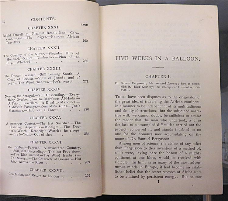 This stunning author's copyright edition of Jules Verne's "Five Weeks in a Balloon: A Voyage of Exploration and Discovery in Central Africa" is now in the possession of St Mary's Books. Bound in grey cloth featuring colourful illustration of a palace on the cover and a balloon on the spine, this hardback book contains i-vi, 300pp.and 16 pages of advertisements to the back of the book. Inside, one finds a stunning full-colour frontispiece, "An Unexpected Companion" depicting the expedition's balloon being followed, as well as some full colour illustrations throughout the book. This book is in good condition, though the frontispiece page is coming loose and there is some very minor foxing throughout - the book remains otherwise clean and readable, and the illustrations remain bright and vibrant. This story of adventure and exploration is looking for a new home, and would make for a perfect gift for any Jules Verne enthusiast.