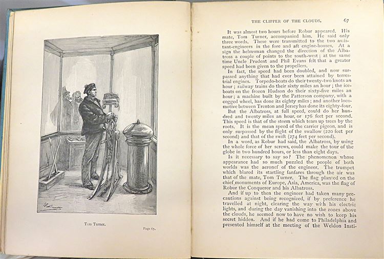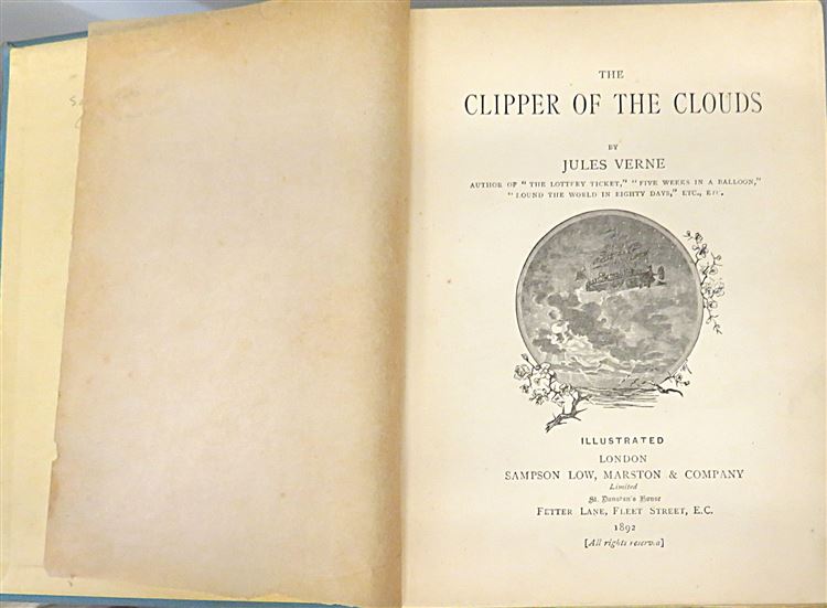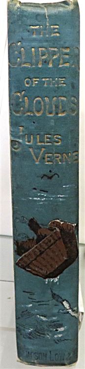St Mary's Books is proud to present this stunning 1892 edition of "The Clipper of the Clouds" by Jules Verne. Bound in blue cloth, this hardback book has all-edge gilt and gilt lettering to the cover and spine, as well as a gorgeous pictoral board depicting the airship flying among mountains. Inside, one finds i-viii, 192pp., and 32 pages of advertisements to the rear. This illustrated edition contains 41 black ink drawings, and a frontispiece which is sadly missing in this copy, all supplementing the tale of the inventor, Robur, and his adventures in the airship, Albatross. This tale of action and adventure is in good condition - though the prelims are missing, there is some splitting at the hinges, and the cover is slightly bumped and worn - the copy remains otherwise clean and readable, remarkably so for its age. "The Clipper of the Clouds" is looking for a new home, and would be a perfect gift for any Jules Verne enthusiasts.