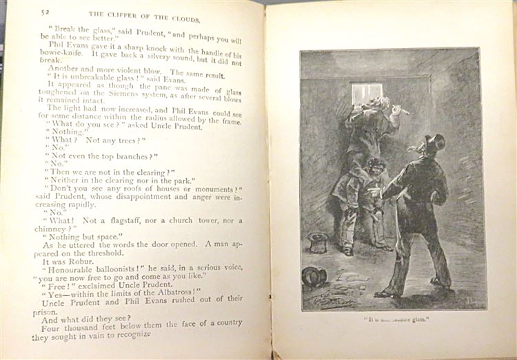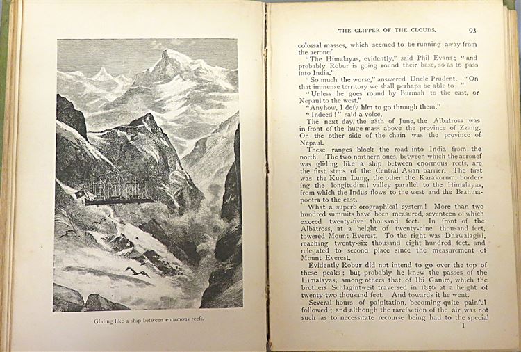 This lovely "new and cheaper" edition of "The Clipper of the Clouds" by Jules Verne is now in the possession of St Mary's Books. Bound in an olive green cloth with gold gilt lettering, this hardback book features a stunning blue, brown, and black ink illustration of the "Albatross" on its cover. Inside, one finds i-viii and 186 pp., recounting the tale of the inventor Robur and his adventures on his airship, peppered with whimsical black ink illustrations. This book is in fair condition - the cover and spine are significantly worn in places, there is foxing throughout the book, there is some splitting to the spine, and pages 187-192 are missing, including the illustration on page 191. This stunningly presented edition is looking for a new home, and would make for a perfect gift for any Jules Verne enthusiast.