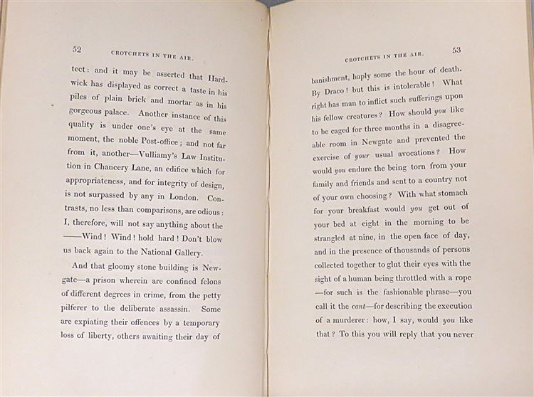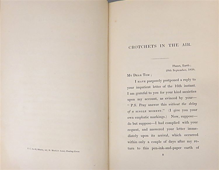St Mary's Books is proud to present this 1838 first edition of "Crotchets in the Air; Or, An (Un)Scientific Account of a Balloon-Trip, in a Familiar Letter to a Friend" by John Poole, Esq.. Bound in a rich blue cloth with intricate blind tooling and a balloon in gold gilt on the cover, this hardback book contains 98 pages of text and 2 pages of advertisements to the back of the book.This book is in remarkably good condition considering its age and rarity. Other than some minor bumping and fading of the cloth cover, this text is impeccable, with few notable imperfections other than some very minor foxing. This seminal text, which stood out for being a humorous and personal account of a balloon trip, contrary to the usual contemporary dry and scientific remarks, is looking for a new home, and would make for a perfect gift for any 19th century ballooning enthusiast.