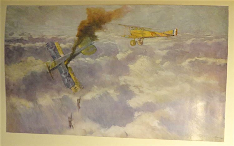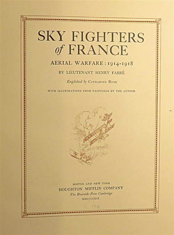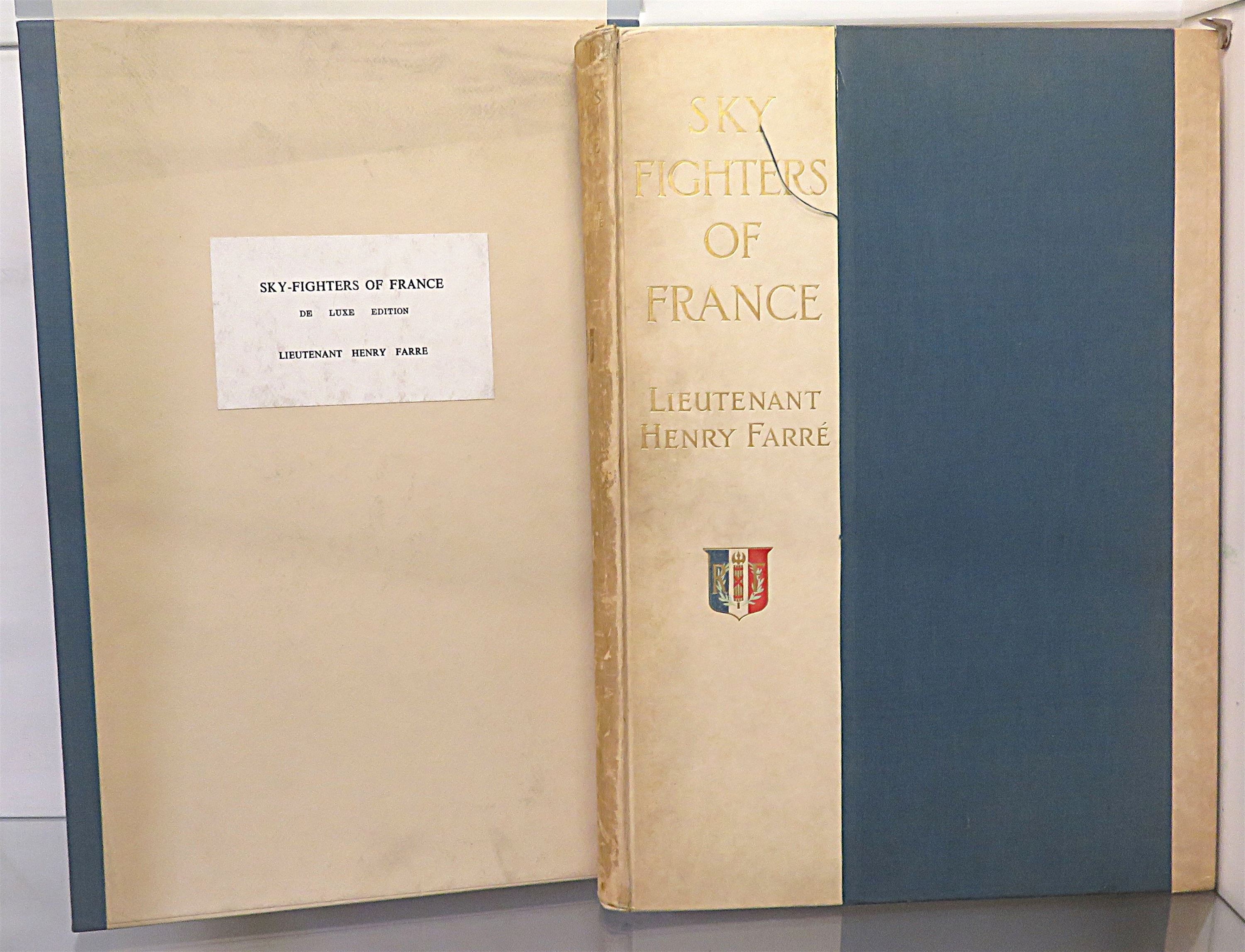 Hardback. The large paper edition of which only two hundred copies were printed at the Riverside Press, Cambridge, Massachusetts, USA In September, 1919. A handsome copy half bound with cream paper covered boards and green silk cloth sides with gilt lettering and Republique Francoise emblem to the front and spine. Illustrated with 19 stunning tipped-in clour plates, by the Author, 11 of which depict aerial fights with 8 portraits of French and American World War One fighter pilots. Signed by the Author to one of the blank pages. There is a little fraying of the cloth to the front and the cream binding has darkened a little especially to the spine. Although the binding presents well and is generally in good condition. There are no marks, inscriptions or foxing to the pages and text block remains quite firm. A few of the pages are uncut. Housed in a lightly discoloured but firm slip case. Overall a lovely copy. Written and Illustrated by the author, this books brings together Henry Farre's personnal experiences and exploits in the Great War starting on December 1914 as he left Paris to join the Twenty First Squadron V.B. This account is interspersed with dialogue between Farre and the fighter pilots he flew alongside. A remarkable book.