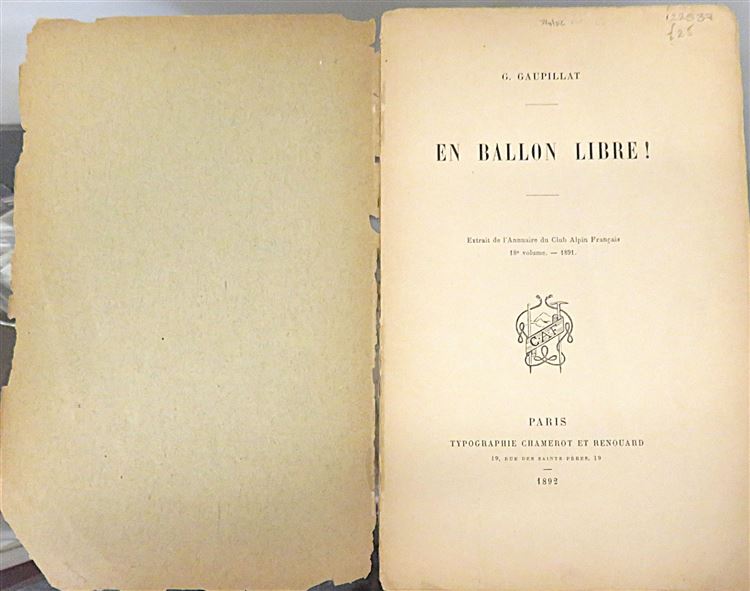 This lovely 1892 edition of "En Ballon Libre!: Extrait de l'Annuaire du Club Alpin Francais" by G. Gaupillat is in its original paper binding, with black ink lettering and decorations. Inside one finds 22 pages of text (in French), supplemented by maps, diagrams and black ink illustrations, detailing the course of a balloon journey. This book is in good condition - though the original paper covers can only be described as fair as they are ripped and worn in places, the pages inside have been well protected, and are clean and readable. Thsi book is looking for a new home, and would make for a perfect gift for any late 19th century french ballooning enthusiast.