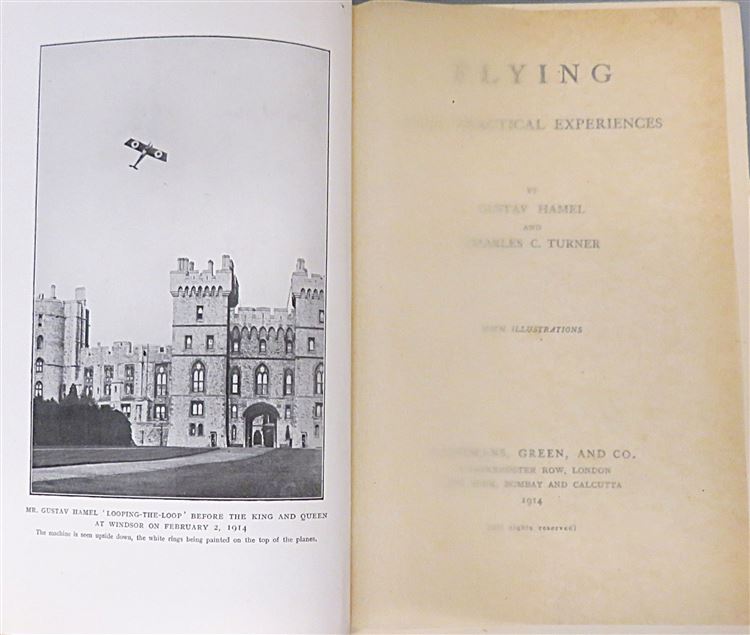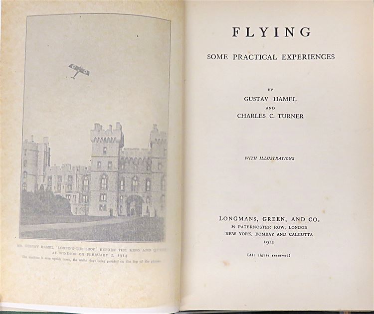 This lovely 1914 edition of "Flying: Some Practical Experiences" by Gustav Hamel and Charles C. Turner is bound in green cloth and features a lovely gold gilt illustration of a plane on the cover. Inside this hardback book, one finds i-xii and 341pp., detailing the practical contemporary experience of flying, supplemented by black and white photographs such as the one on the frontispiece depicting Mr Gustav Hamel "looping the loop" before the King and Queen at Windsor. This lovely book is in good condition, other than some offsetting to the front free endpapers, and some very minor foxing throughout, there are few other notable imperfections. "Flying: Some Practical Experiences" is looking for a new home, and would make for a perfect gift for any early 20th c. aviation enthusiasts.