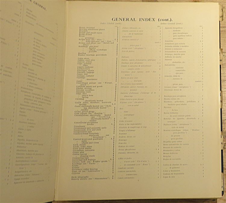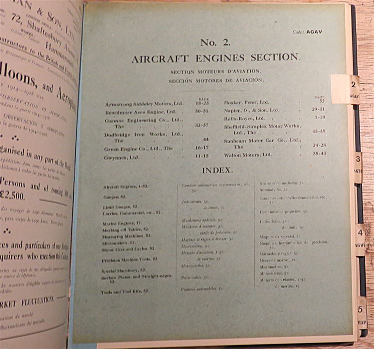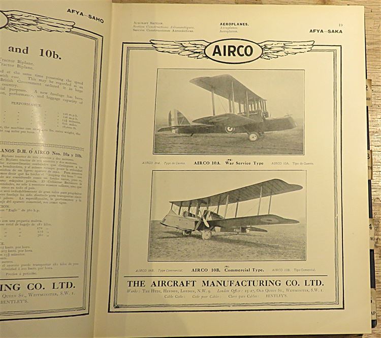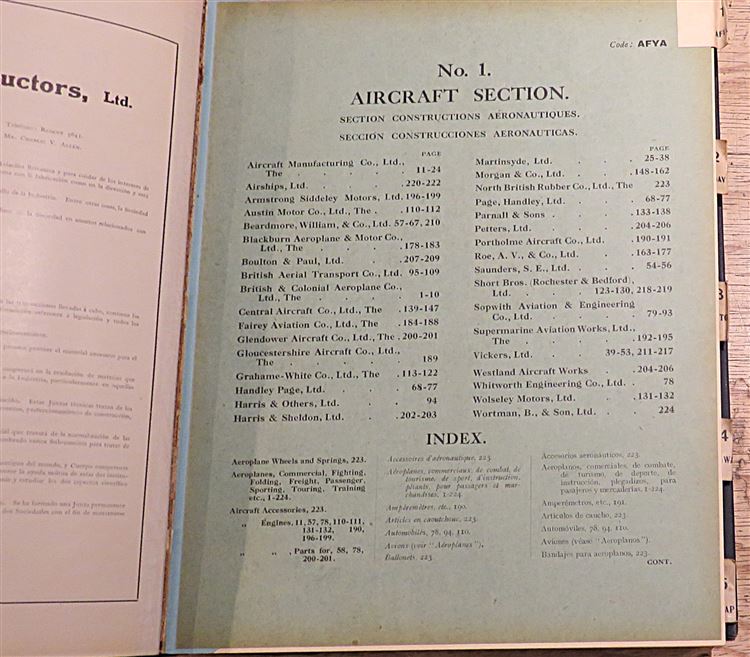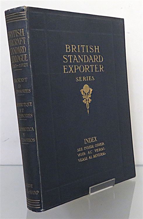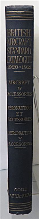Hardback. This is the Standard Work of Reference on British Sources of Supply. Bound in the original navy cloth with gilt titles to the front and spine. Text in English, French and Spanish. With five dividers for each section. Overall a very good copy with just slight fading to the spine. The binding, otherwise is bright and clean and shows minimal wear. Internally the text block is tight and the pages are very clean. A fascinating volume composing of five sections, Aircraft, Aircraft Engines, Components and Assembly Units Section, Timber, Metals, Dopes Etc Section and Accessories Section. Illustrated with many diagrams and photographic images. This was a crucial publication showcasing Britain's burgeoning aviation industry globally, detailing manufacturers, designs, and specifications to promote exports and establish standards for aircraft and components post World War One, acting as an official directory for international buyers.