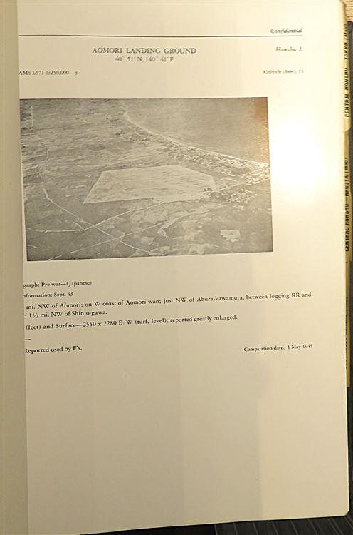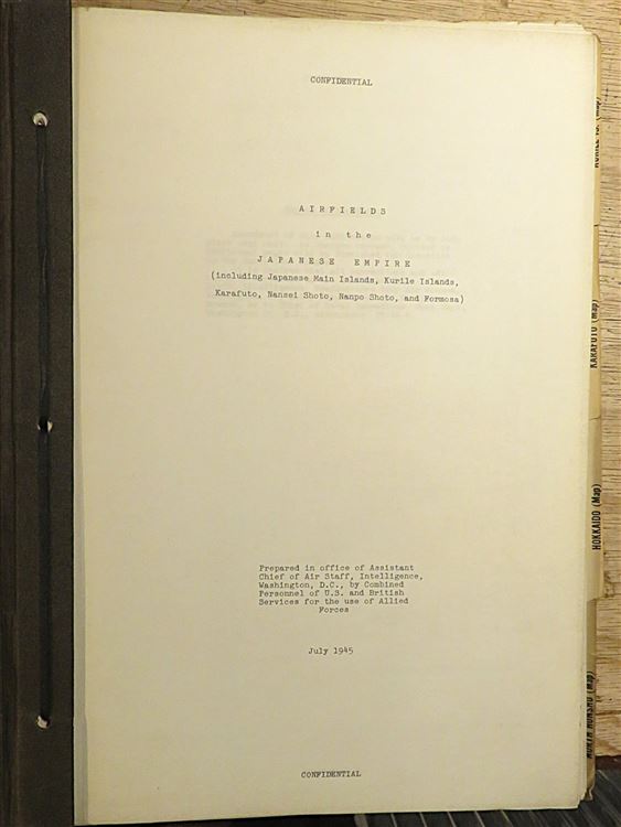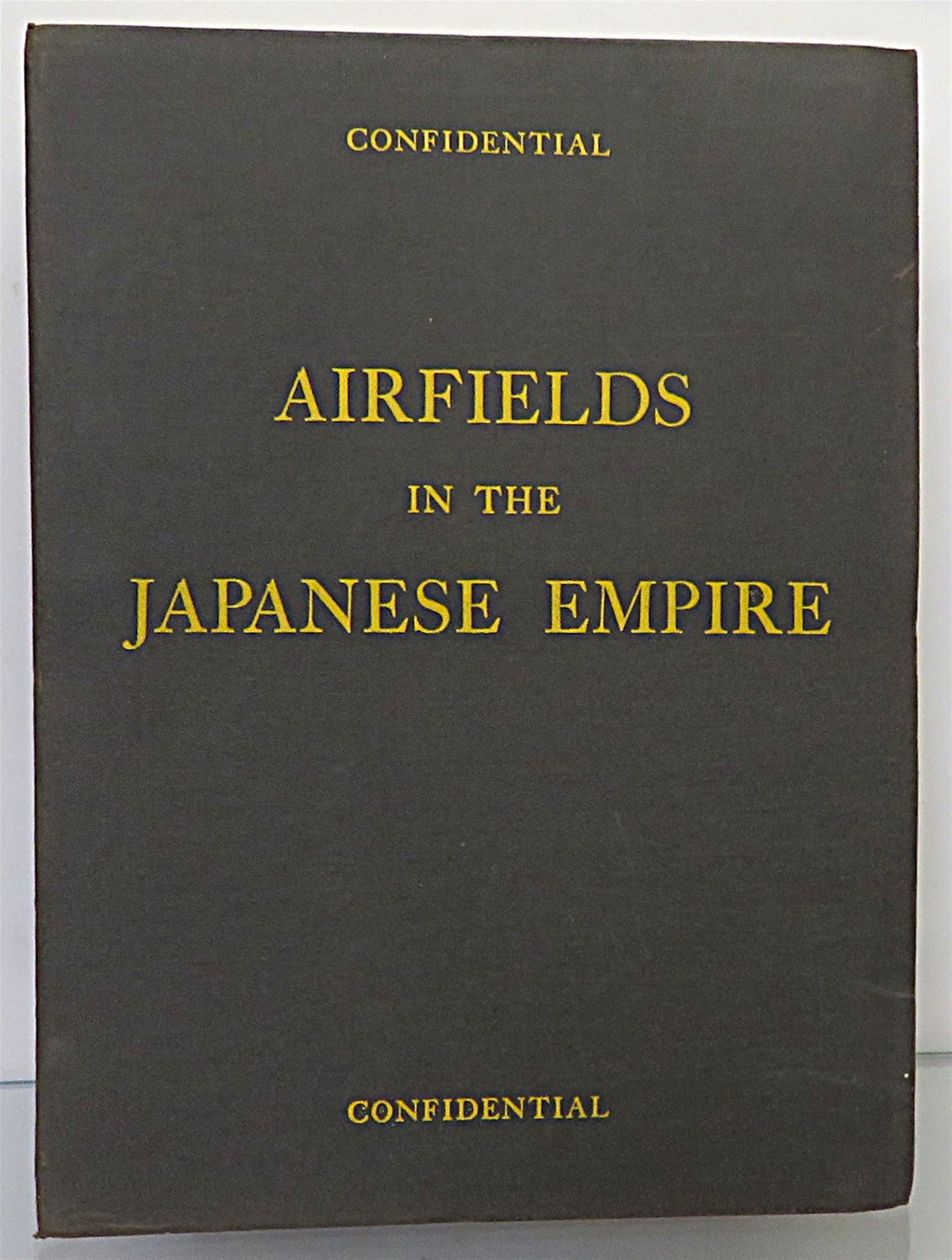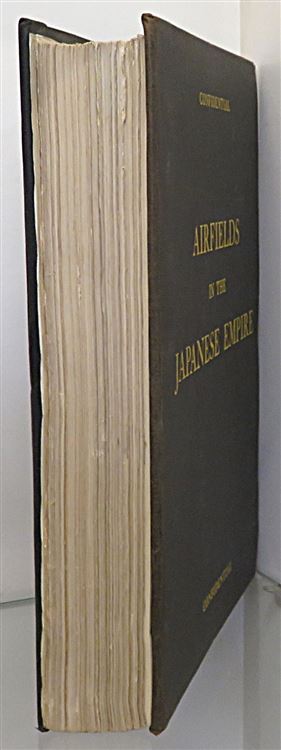 Harback in archival binding. Airfields in the Japanese Empire including Japanese Main Islands, Kurile Islands, Karafuto, Nansei Shoto, Nanpo Shoto, and Formosa. Prepared in office of Assistant Chief of Air Staff, Intelligence, Washington, D.C. by Combined Personnel Of U.S. and British Services for the use of Allied Forces. Confidential, Published July 1945. A typed report full of photographic images and diagrams, with sectioned inserts of each Japanese region, presented in a military style folder with front and back board only. The components held together by black ribbon. Scarce with none currently on the market. A fascinating piece of Wartime history.