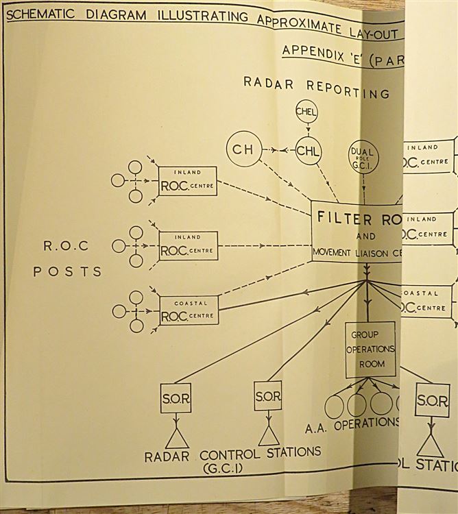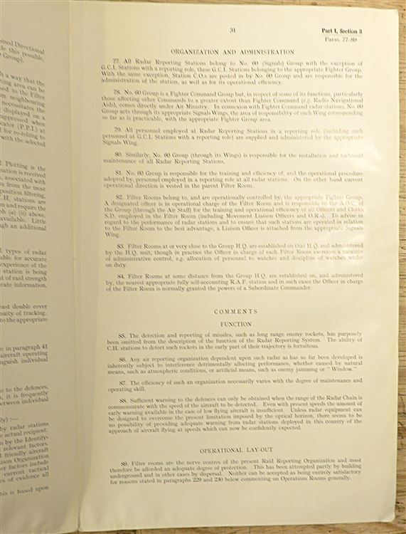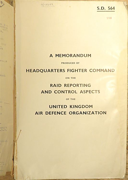 Original brown paper wrappers, showing heavy wear and chipping, with significent loss to the spine. Front cover features an ink stamp and red pen mark. Internally clean, though the final pages are stuck together, causing small tears and loss along the fore-edge from previous attempts to separate them. Includes two loose typed at the front. A fragile reading copy. A memorandum that describes the crucial elements of Britain's pre World War II, Battle of Britain air defense, centered on the innovated Dowding System.