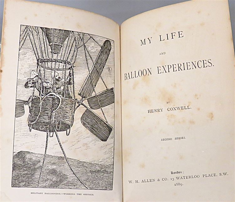 St Mary's Books is proud to present this stunning 1889 second edition of Henry Coxwell's "My Life and Balloon Experiences", signed by the author. Bound in bright orange cloth, and featuring a stunning black ink illustration of two men in a hot air balloon, this hardback book has gold gilt lettering and decorations. Inside, past the decorated free endpapers, one finds i-xi and 283 pages of text, detailing Henry Tracey Coxwell's life of adventure and excitement in the ballooning world. This book is complete with stunning illustrations, such as the frontispiece, an charming illustration of two men in uniform, scanning the ground with telescopes, titled, "Military Ballooning - Working the Signals". This book is in very good condition, though the cloth on the spine is slightly faded and there is some minor foxing on the free endpapers and the title page, the rest of the book remains clean and readable. This stunning copy is looking for a new home, and would make for the perfect gift for any Victorian-era Ballooning enthusiast.