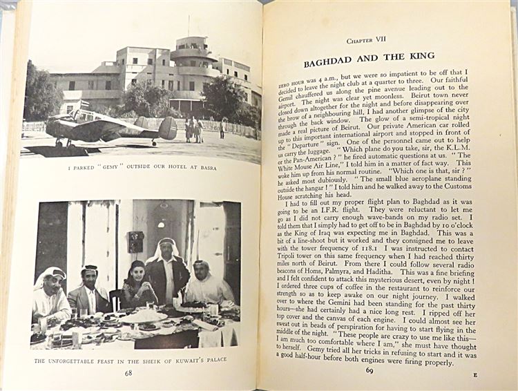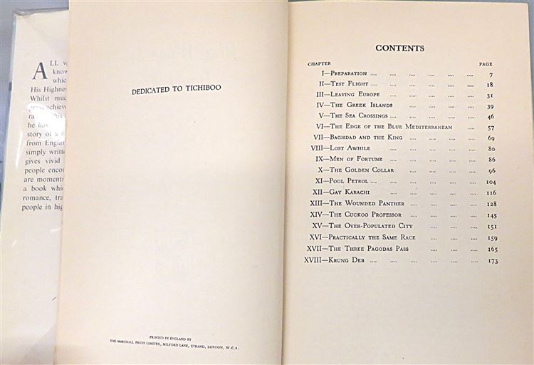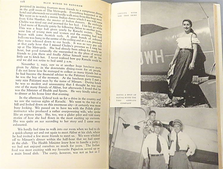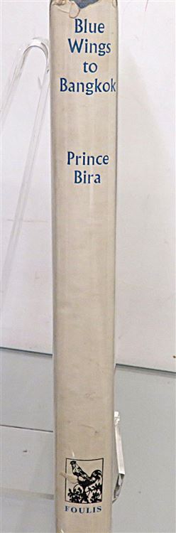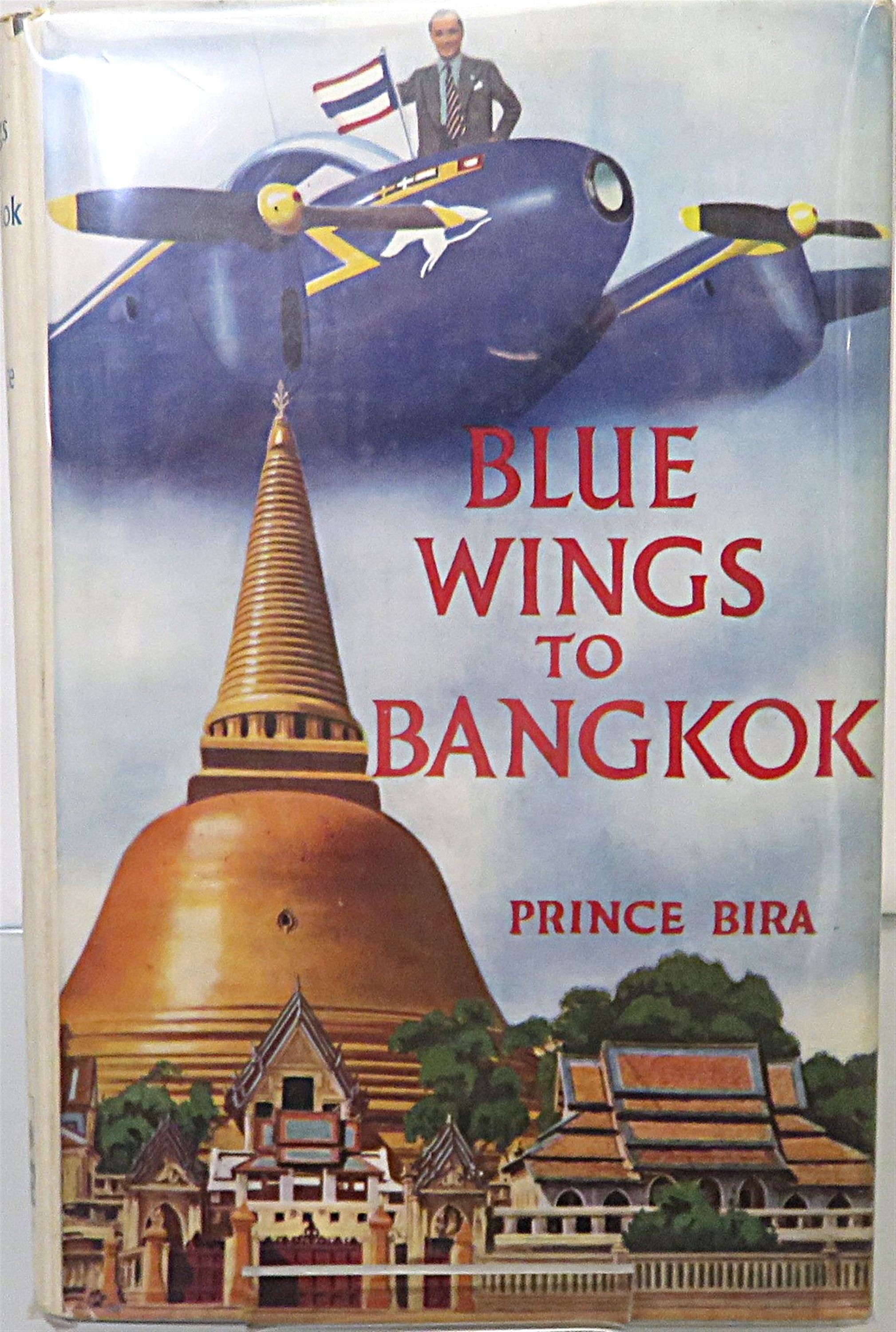 St Mary's Books is proud to present "Blue Wings to Bangkok" by His Highness Prince Birabongse of Siam (Thailand). Housed in its original pictoral dustjakcet featuring a stunning full colour illustration of a Thai temple, this hardback book is bound in blue cloth. Inside, past the charming illustrated free endpapers highlighting the Prince's route, one finds 184 pages of text, complete with stunning black and white photographs. This descriptive, dramatic, and romantic tale of the Prince's flight from England to Bangkok and his adventures along the way is in very good condition. The dustjacket has been well preserved, and other than some very minor foxing on the edges, there are few other notable imperfections. "Blue Wings to Bangkok" is looking for a new home, and would make for a perfect gift for any travel enthusiast.