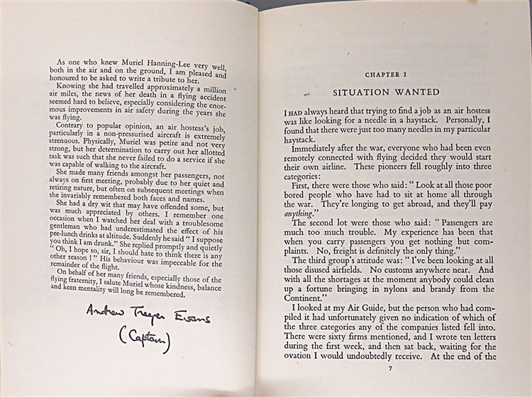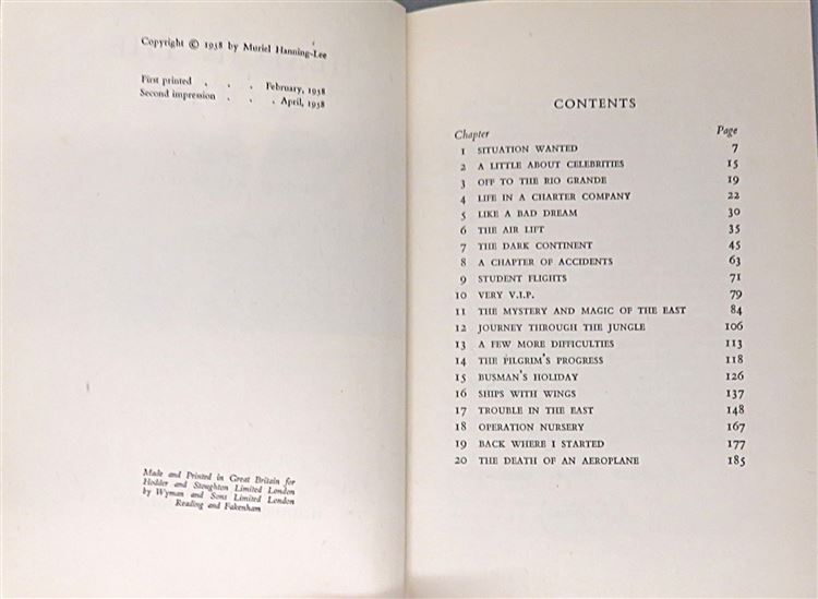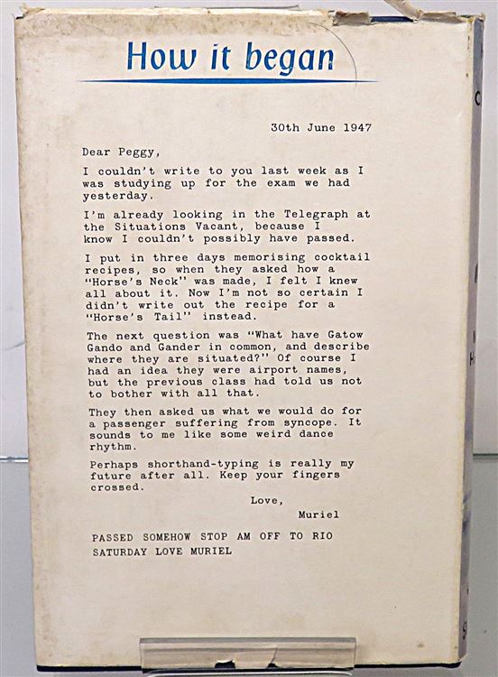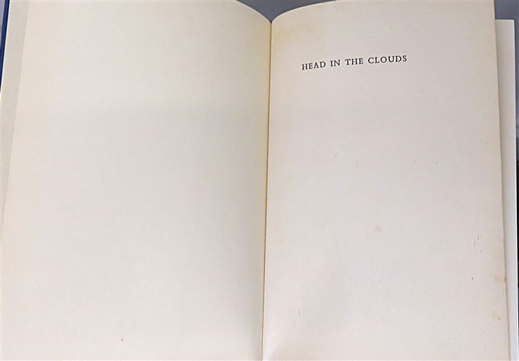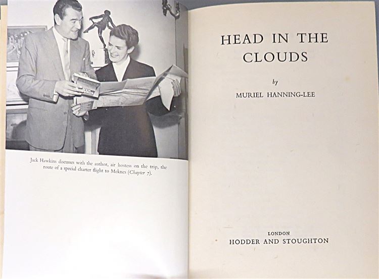 This lovely 1958 second impression of "Head in the Clouds" by Muriel Hanning-Lee recounts her experiences and adventures as an air hostess. Housed in its original pictoral dustjacket, featuring a charming illustration of a plane in the clouds, this hardback book is bound in navy cloth with gold gilt lettering to its spine. Inside, past the frontispiece photograph of Hanning-Lee with Jack Hawkins, this book has 191 pages of text. This lovely story of an air hostess' travels and adventures is in very good condition. Though the dustjacket is slightly bumped and thus can only be described as good, the book itself remains clean and readable with few notable imperfections. "Head in the Clouds" is looking for a new home, and would make for a perfect gift for any travel enthusiast.