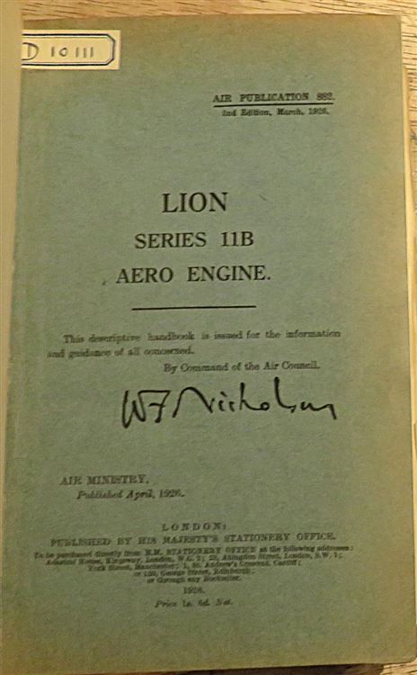 Hardback. Handsomely bound in half red coth with marble paper sides and marble endpapers with the original card wrappers bound in. LION Series IIB Aero Engine, Air Publication 882, 3rd Editiion January, 1928 is also present within the book, with the original wrappers.There is a signature of WF Nicholson to several pages within, possibly original due to several ink splashes. There are several library labels and ink stamps within the book. The pages, however are very clean and illustrated with several photographic images, diagrams and folding plans. The binding is a little worn with a white library mark to the base of the spine and embossed stamp to the rear. Amendment List No. 3 and 4 have been loosely placed within the book. A descriptive handbook for the information and guidance on the Lion series Aero-Engine, one of the most successful high powered aero-engines developed during the First World War. A must for any aviation enthusiast.