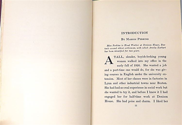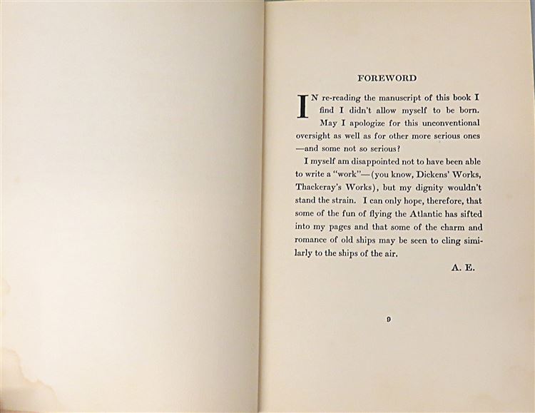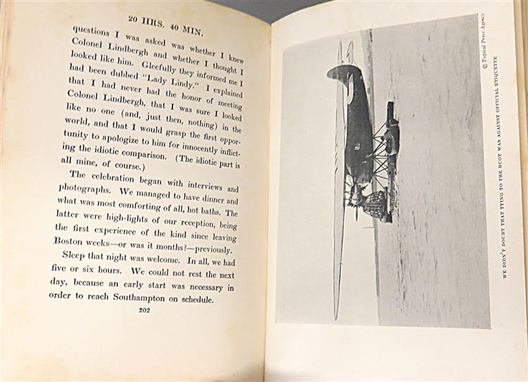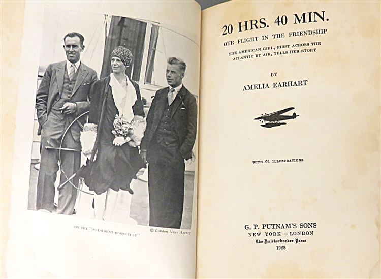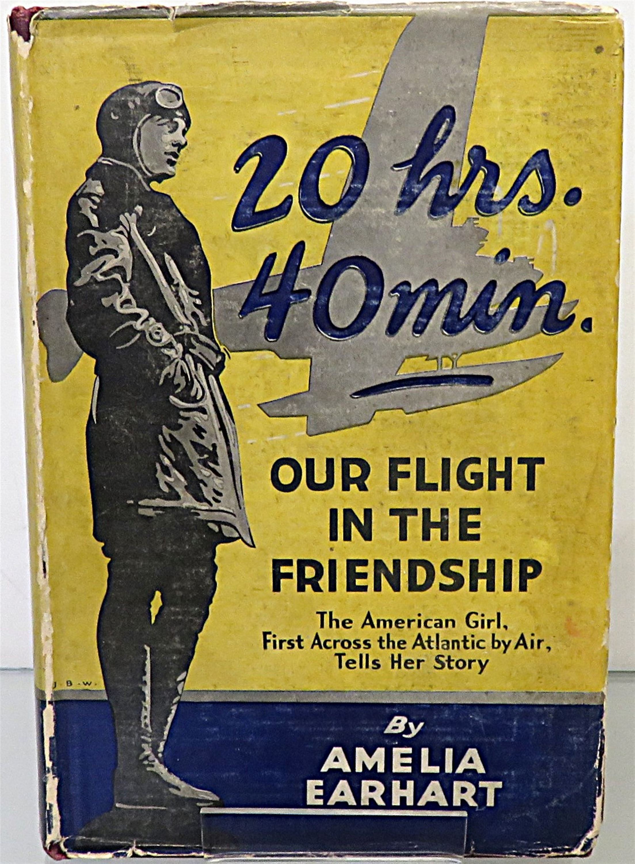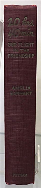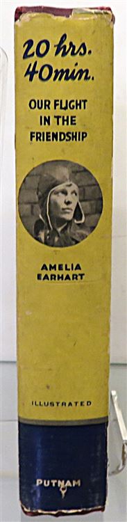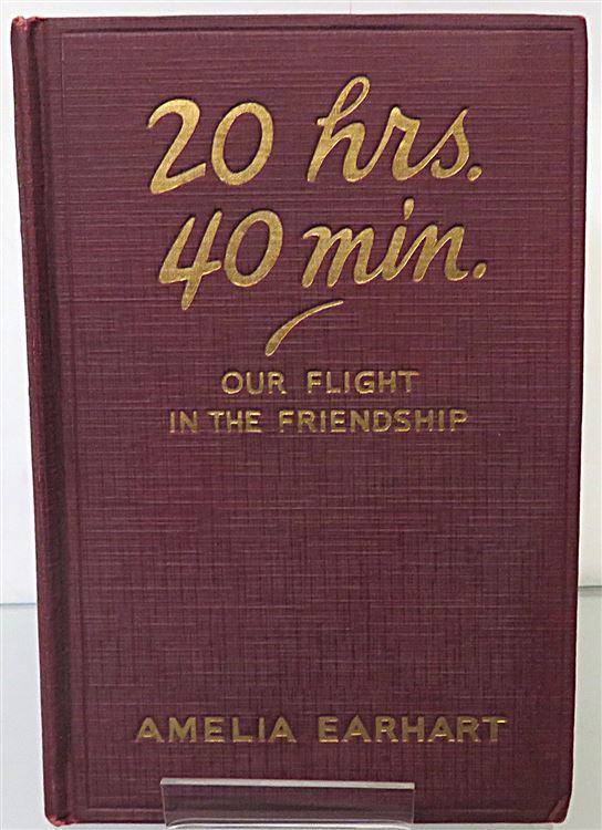 St Mary's Books is proud to present this stunning November 1928 Second Printing of "20 Hrs. 40 Min. Our Flight in the Friendship. The American Girl, First Across the Atlantic by Air, Tells her Story" by Amelia Earhart. Housed in its original yellow dustcjaket, featuring blue ink text and a lovely black ink illustration of Earhart and a plane, this hardback book is bound in burgundy buckram with gold gilt lettering. Inside, past the charming free endpapers which contain photographs of Earhart's writing, one finds 314 pages of text, complete with stunning black and white photographs, including the frontispiece image of the crew of the "Friendship". This amazing story, comprised mostly from the log-book in which Earhart wrote in throughout the journey, is a tale not just of the flight itself, but an appraisal of the future of aviation, especially of the future of women in the air. This book is in very good condition. Though the pre-war dustjacket has some losses, other than some minor damp stains and foxing to the edges, this copy remains otherwise clean and readable - remarkably so considering its age and rarity. "20 Hrs. 40 Min." is looking for a new home, and would make for a perfect gift for any aviation or Earhart enthusiast.