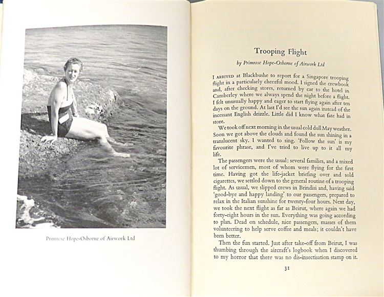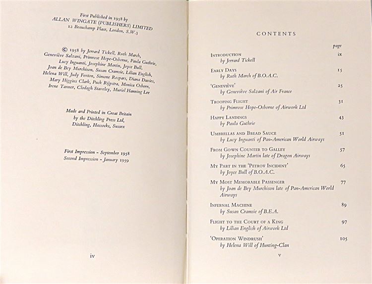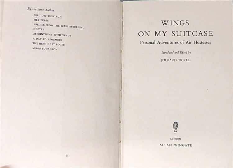 This lovely 1959 second impression of "Wings on My Suitcase: Personal Adventures of Air Hostesses", edited and introduced by Jerrard Tickell, is now in the possession of St Mary's Books. Housed in its original dustjacket, featuring a black and white photograph of an Air Hostess boarding a plane, this hardback book is bound in navy cloth with gold gilt lettering to the spine. Inside, one finds i-xiv and 193 pages of text covering the accounts of 20 Air Hostesses, and complete with black and white photographs bringing to life the tales of their travels. This book, and its original dustjacket, are in very good condition - remarkable considering the age of this copy. Other than some minor bumping to the dustjacket, this copy has few notable blemishes or imperfections. "Wings on My Suitcase" is looking for a new home, and would make for a perfect gift for any aviation enthusiasts.