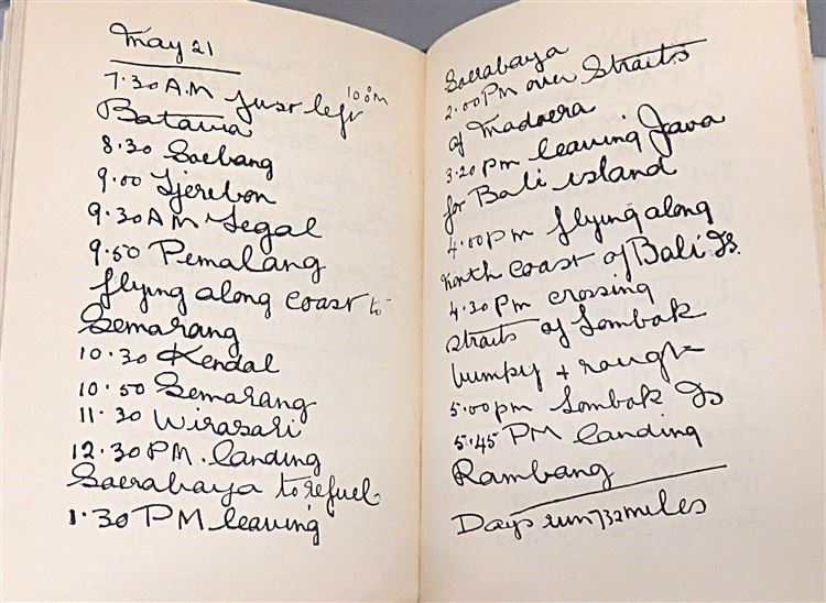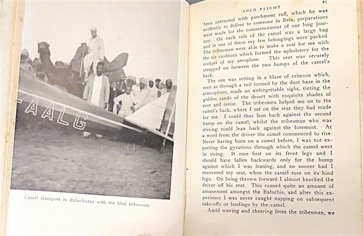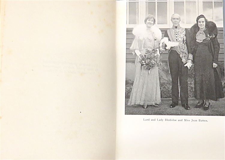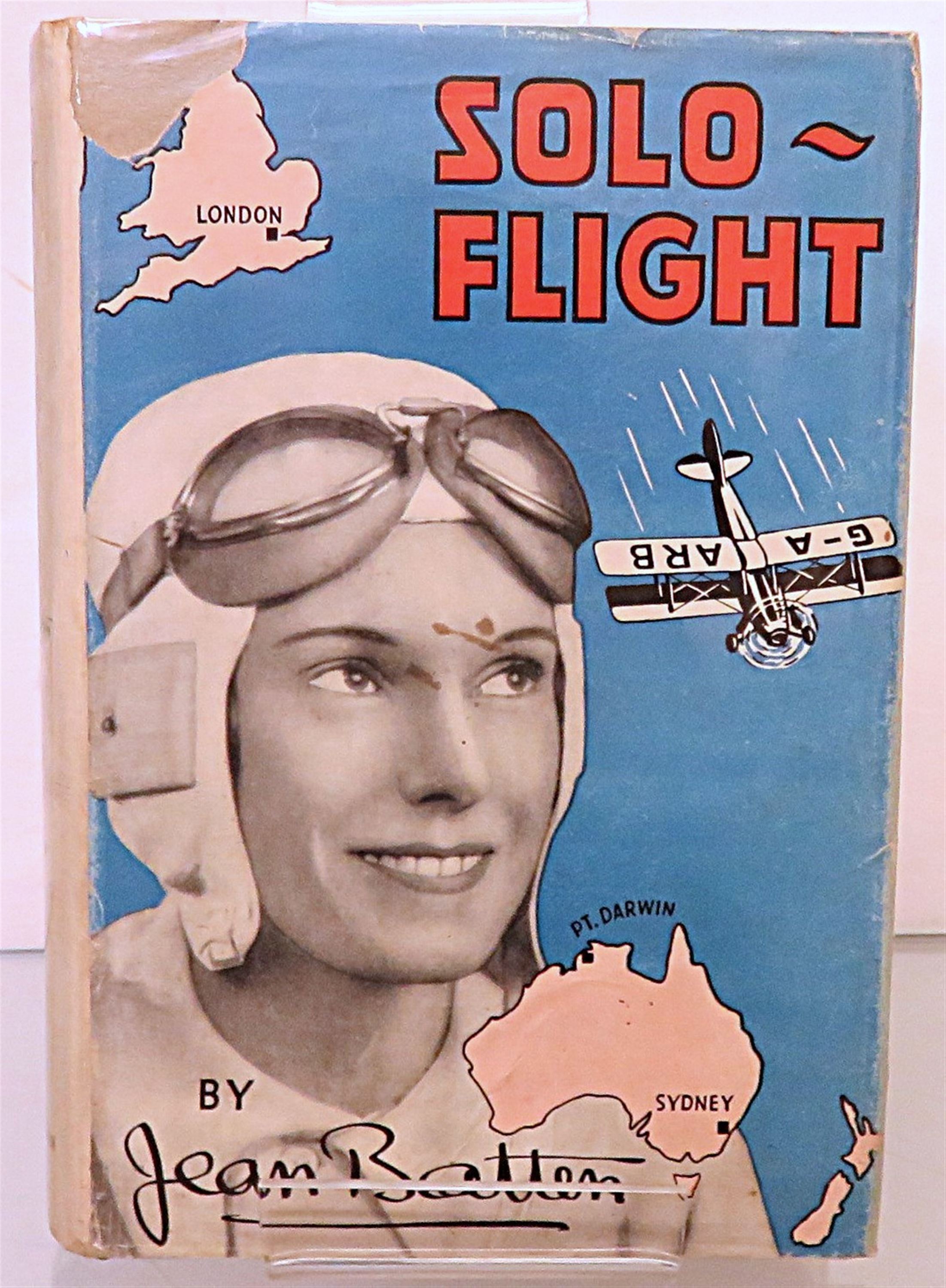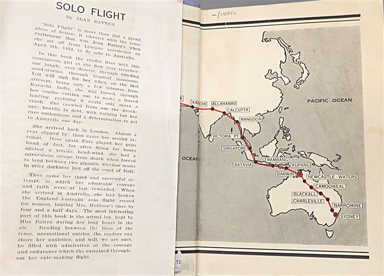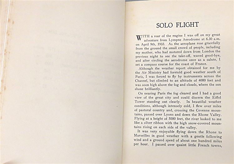 St Mary's Books is proud to present this lovely 1934 first edition of "Solo Flight" by Jean Batten. Housed in its original blue dustjacket featuring charming cartoonish illustrations, and a stunning black and white photograph of Batten, this hardback book is bound in a lovely light blue cloth. Inside, past the map highlighting Batten's route on the free endpapers, one finds 215 pages of text and 39 pages to the back of the book containing a facsimilie of Batten's flight log, some notes of congratulation, and comments on flight. This stunning book is complete with black and white photographs, including numerous images of Batten's plane. This amazing book details Batten's successive attempts and experience flying from England to Australia in record-breaking time. This copy is in very good condition - though there is some damage to the dustjacket which can only be described as good, the book, other than some fading to the spine, is remarkably well-preserved given its age and rarity. "Solo Flight" by Jean Batten is looking for a new home, and would make for the perfect gift for any aviation enthusiasts.