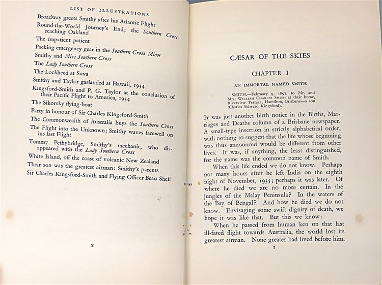This lovely 1937 first edition of "Caesar of the Skies: The Official Life of Sir Charles Kingford-Smith" by Flying Officer and Personal Assistant Beau Shiel in collaboration with Colin Simpson, is now in the possession of St Mary's Books. Housed in its original blue paper dustjacket featuring a black and white photograph of "Smithy" to the centre, this hardback book is bound in light blue cloth with dark blue ink lettering to its spine. Inside, one finds i-x, 202pp., and 16 pages of black and white photographs to the back of the book. This book which highlights the exciting adventures and remarkable career of the man Flying Officer Beau Sheil hails as "Caesar of the Skies", is in very good condition. Though the dustjacket is bumped and torn and thus can only be described as good, the book itself is remarkably clean and readable for a copy of this age and rarity. "Caesar of the Skies" is looking for a new home, and would make for the perfect gift for any aviation enthusiast.