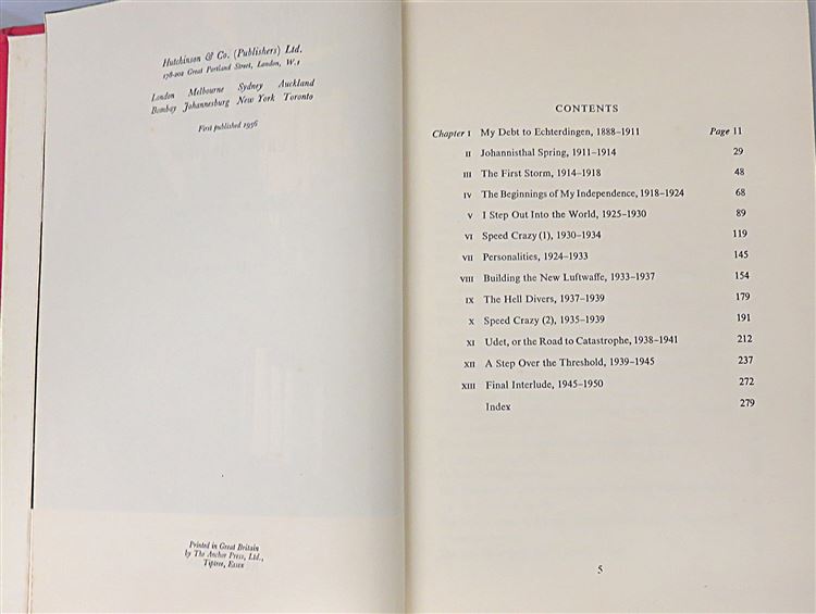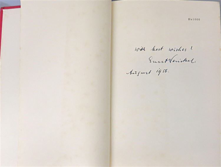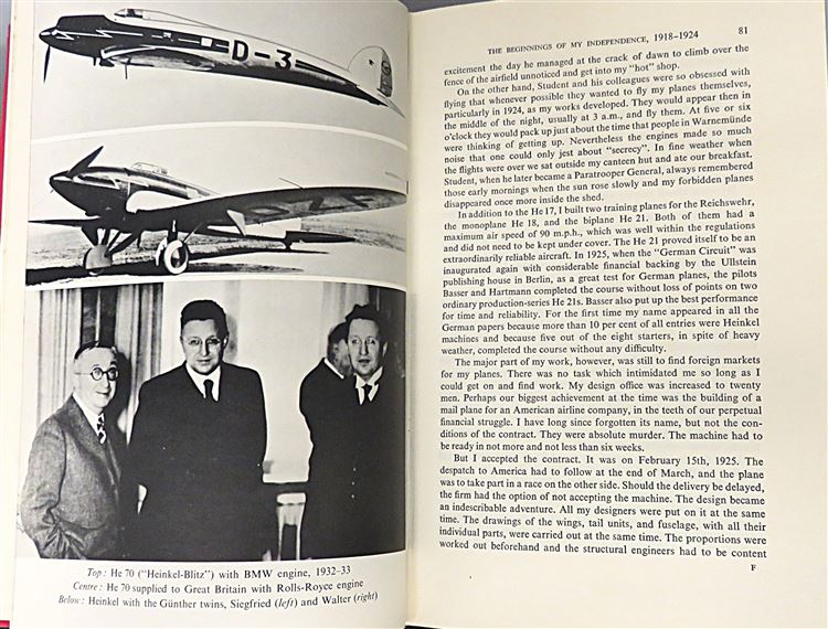This lovely 1956 first edition of "He. 1000", an autobiography by Ernst Heinkel is signed by the author. Housed in its original bright blue pictoral dustjacket featuring a dramatic illustration of a dive-bombing place, this hardback book is bound in crimson cloth with gold gilt lettering to its spine. Inside, one finds 287 pages of text, supplemented by black and white photographs such as the frontispiece image of Heinkel. This fascinating autobiography detailing the story of a tinkers son "who just had to build aeroplanes", is in very good condition. Though the dustjacket is torn and bumped and thus can only be described as good, the book itself is remarkably well preserved, with few notable blemishes or imperfections. "He. 1000" is looking for a new home, and would make for a perfect gift for any aviation enthusiast, military historian, or autobiography lover.