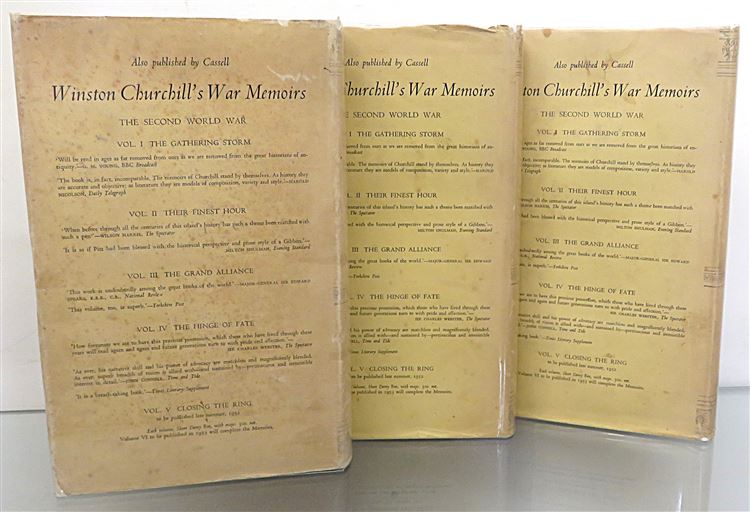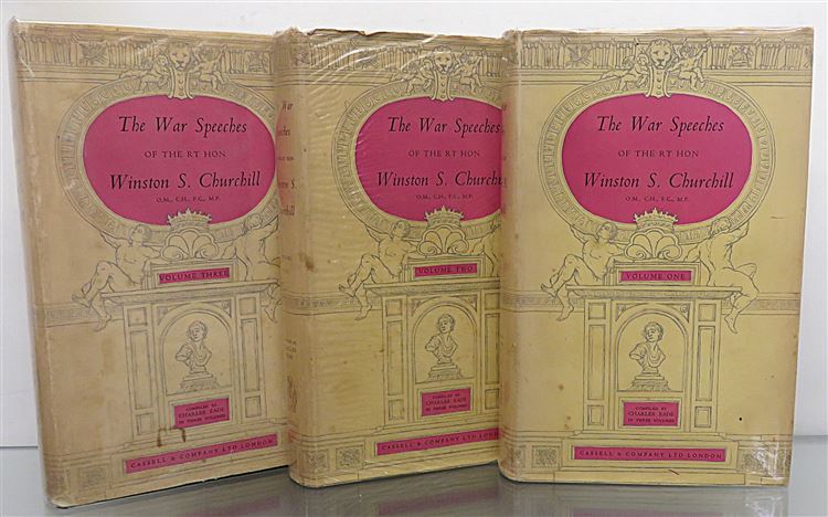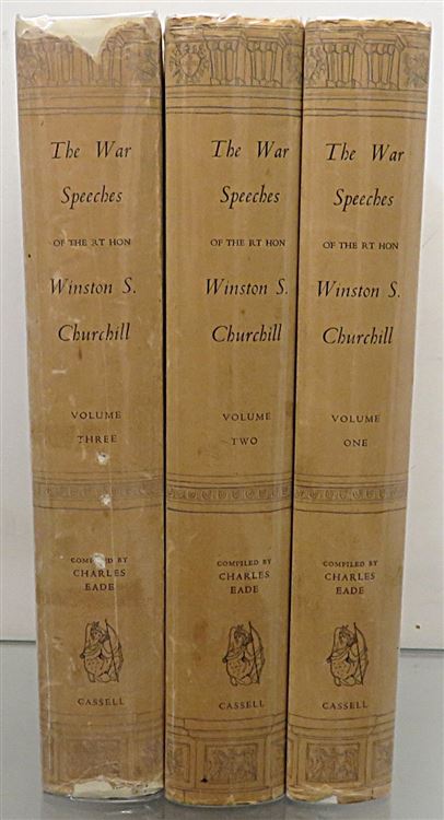 Hardback. A First Edition set of Winston Churchill's most inspirational and memorable War Speeches. The speeches not only served as wartime morale boosters but also earned him the Nobel Prize for literature in 1953, with many delivered in Parliament or broadcast live to the nation. Compiled by Charles Eade this three volume set are complete with their dust jackets. Underneath lie navy cloth boards with bright gilt titles to the spines. The dust jackets are in good condition despite a little foxing and edge wear. There are small pieces missing to the spine's of volume one and volume three with small holes to the navy cloth (spine) on volume three. Foxing, tape residue and booksellers ink stamp to the endpapers of volume three. Neat inscription and ink book plate to the front free endpaper of the first two volumes while the rest of the pages are clean. Volume one, published, 1951. pp. xv + 483. Volume Two, published 1952, pp. xv + 560. Volume Three, published 1952, pp. xvi + 578. Overall a very good set, the definitive collection of Churchill's powerful oratory from 1940 to 1945.