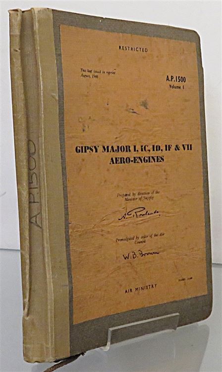 The Official Royal Air Force Manual for the Gipsy Major I, IC, ID, IF, AND VII Aero Engines. Detailing the installation, operation and maintenance of the De Havilland Gipsy Major Series of Engines. Card wrappers held together by string and a cloth spine. The pages within contain many photographic images and folding diagrams, some of which are in colour. Sectioned with orange dividers. There is a signature to the amendment record sheet. Previous owner's signature to the front paste-down and wear to the title page. Overall a used although maintaned copy. The binding is worn although presentable and the pages within are clean. A scarce title, a must for any aviation enthusiast.