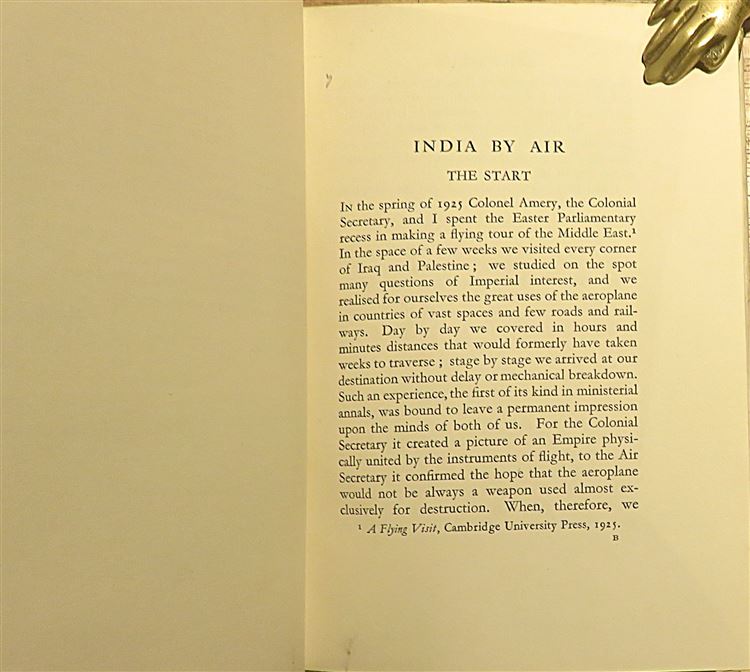 Hardback. A First Edition of the first-hand account of the first civil passenger flight from London to Delhi by Sir Samuel Hoare with an introduction by Lady Maud Hoare. Inscription from the authors to the front free endpaper, dated Christmas 1927. The dust jacket with a pictorial front cover shows a little edge wear and discolouration to the rear. It does however, have a clean front cover and is unclipped. Underneath lie pale blue paper covered boards with a small white paper title band to the spine. The extremities and spine are a little toned although clean and showing very little wear. There is a touch of foxing to the prelims and to the rear otherwise the pages are very clean. Illustrated with several black and white photographic images and maps to the endpapers. Errata sheet inserted into to the contents page. pp. xix + 156. Overall a very good copy.