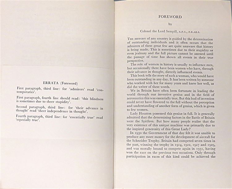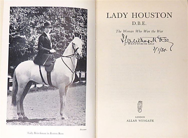 St Mary's Books is proud to present this stunning 1958 first edition of "Lady Houston" signed by the author, J. Wentworth Day. Housed in its original dark blue dustjacket featuring a black and white photograph of Lady Houston, this hardback book is bound in navy cloth with gold gilt lettering on its spine. Dubbed, "The Saviour of the Spitfire", "The Woman who Won the War" and "The Richest Woman in England", Wentworth Day uses 256 pages to tell the story of this incredible woman. This 1958 signed copy is in very good condition - though the dustjacket is bumped and torn and thus can only be described as good, the book itself remains remarkably clean and readable for a copy of this age and rarity. "Lady Houston" is looking for a new home, and would make for the perfect gift for any military historians, aviation enthusiasts, or biography enjoyers.