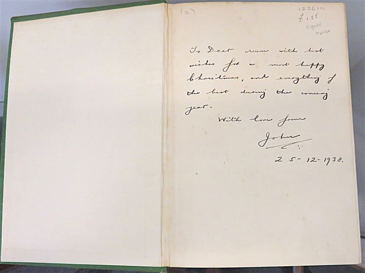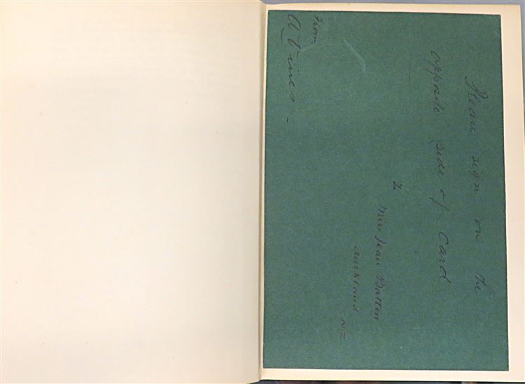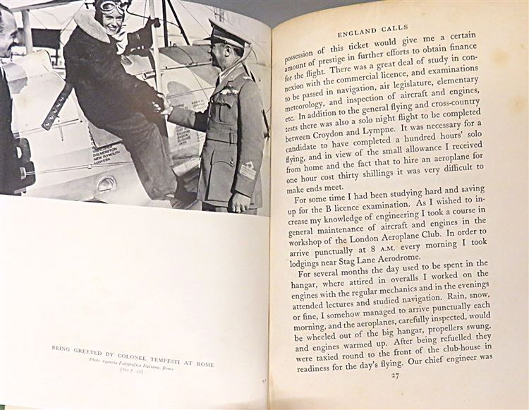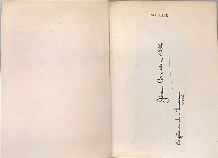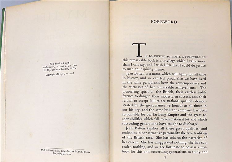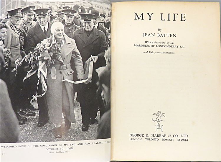 St Mary's Books is proud to present this stunning 1938 first edition of Jean Batten's "My Life" signed by the author and pioneering pilot herself. Housed in its original blue dustjacket featuring a lovely black and white photograph of Batten, this hardback book is bound in green cloth with gold gilt lettering to the spine. Inside, one finds 304 pages of text, peppered with black and white photographs, which help to supplement this wonderful book where Batten describes each of her great flights in vivid detail. This copy is in good condition - though the dustjacket is bumped and torn and thus can only be described as "fair to good", and despite some wearing on the cloth, and some very minor foxing, this edition is otherwise clean and readable, remarkably so considering its age and rarity. This 1938 first edition of "My Life" signed by Jean Batten is looking for a new home, and would make for the perfect gift for any aviation enthusiast.