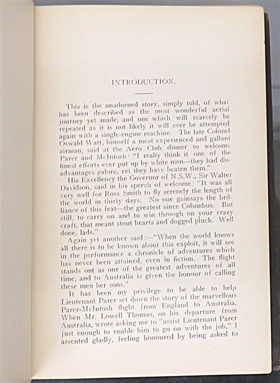 Hardback. A First Edition copy recounting the journey of Ray Parer and John MacIntosh, who completed the first single-engine flight from England to Australia in a salvaged Airco DH-9 IN 1920. With Raymond Parer's signature to the frontispiece and facsimile signature to the base of the foreword. This book also contains a hand written letter dated 1934.."Three Days before the start of the England Australian Air Race..." and signed by Ray Parer and Godfrey Hemsworth. Bound in the publisher's original brown cloth with titles and small pictorial in black to the front with new end-papers. Illustrated with a black and white frontispiece and several more plates throughout. This copy is in good condition despite slight discolouration and fading to the binding. The text block is tight and the pages are clean. pp. 352. Overall a good copy of a scarce title especially one with a signature and letter of the author. A must for any aviation enthusiast.