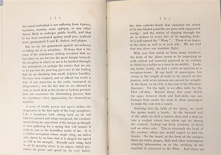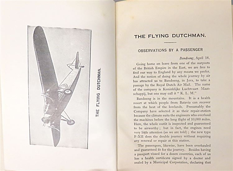 St Mary's Books is proud to present this lovely 1932 first edition of "The Flying Dutchman: Observations by a Passenger" by A. Eggar, signed by the author. This charming little hardback book is bound in green buckram and has black ink lettering on the cover and spine. Inside, one finds 118 pages of text, which offers a descriptive account of Eggar's journey in the aeroplane, the Flying Dutchman, pictured on the frontispiece. This book is in good condition - though the cover is slightly bumped and worn in places, the interior of the book remains remarkably clean and readable, given the age and rarity of the copy. "The Flying Dutchman" is looking for a new home, and would make for the perfect gift for any aviation enthusiasts or travel lovers.