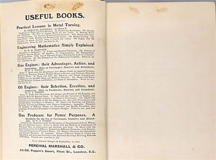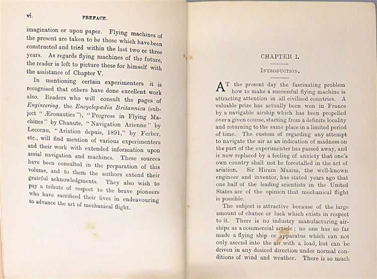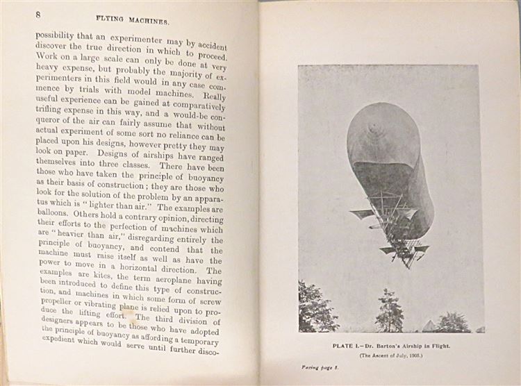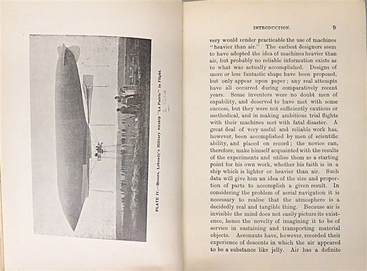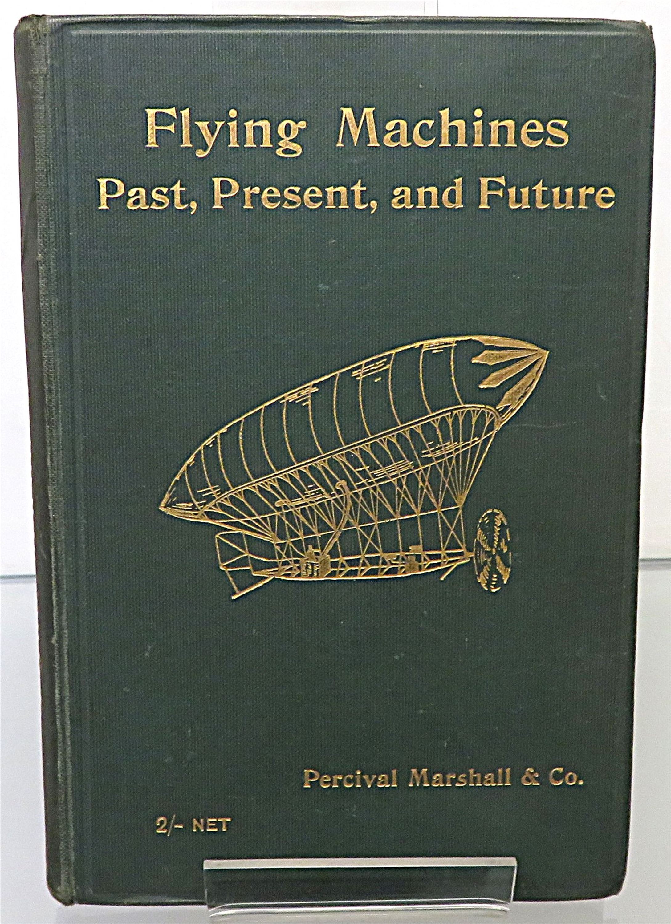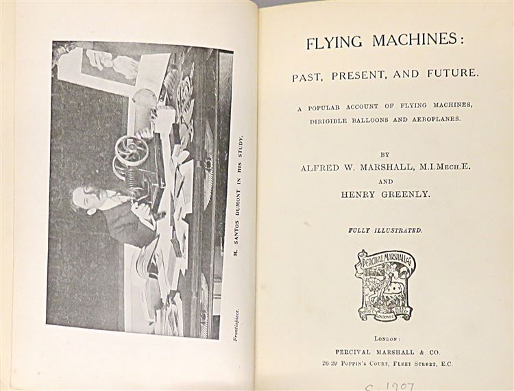 St Mary's Books is proud to present this lovely c.1907 edition of "Flying Machines: Past, Present, and Future. A Popular Account of Flying Machines, Dirigible Balloons, and Aeroplanes." by Alfred W. Marshall, M.I.M.Mech.E. and Henry Greenly. Bound in green cloth with gold gilt lettering and an illustrated dirigiable, this hardback book contains i-vi, 128pp. and 16 pages of advertisements to the back of the book. This edition is supplemented by black ink illustrations and black and white photographs, assisting the reader in their introduction to various flying machines and the theories behind their operation. This book is in good condition - though there are some stains on the advertisement pages at the front of the book, a Royal Aero Club ex libris stamp, and some bumping to the cover - overall the book remains clean and readable. "Flying Machines: Past, Present, and Future" is looking for a new home, and would make for a perfect gift for any aviation enthusiast.