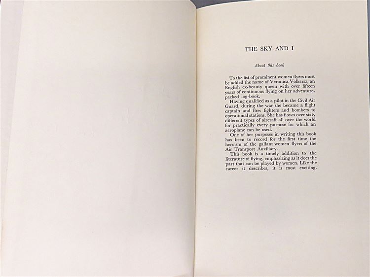 St Mary's Book is proud to present "The Sky and I" by Veronica Volkersz, signed by the author. Housed in its original dustjacket featuring a black and white photograph of Volkersz complimented by red ink lettering, this hardback book is bound in red cloth with gold gilt lettering to its spine. Inside, one finds 200 pages of text supplemented by black and white photos, and detailing Veronica Volkersz experience in going from being a beauty queen to being the first and only woman in Britain flying target planes for anti-aircraft battery practice. This book is in very good condition, though the dustjacket is torn and bumped and thus can only be described as good, the book itself remains clean, bright, and readable. "The Sky and I" is looking for a new home, and would make for a perfect gift for any aviation enthusiast.
