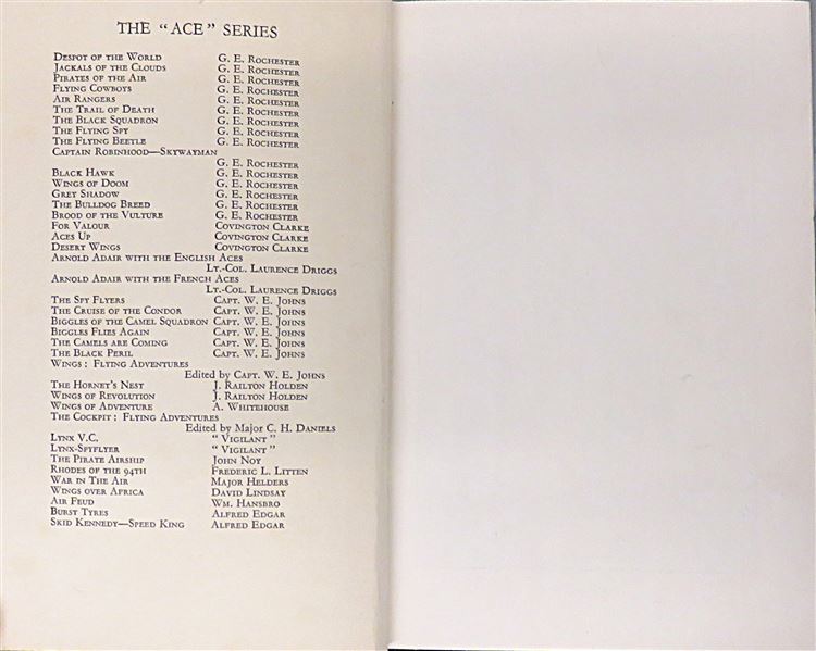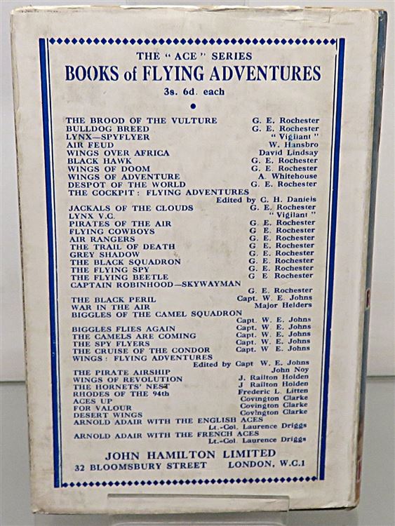 Hardback. The Ace Series. A thrilling air adventure from Geo E Rochester. No date, presumed First Edition. Overall a very good copy with just a little edge wear to the pictorial dust jacket. Not price clipped. Underneath lie green cloth boards with titles in black to the spine. The pages are very clean, illustrated with a black and white photographic frontispiece. pp. 224. A must for any avaition enthusiast.
