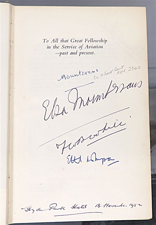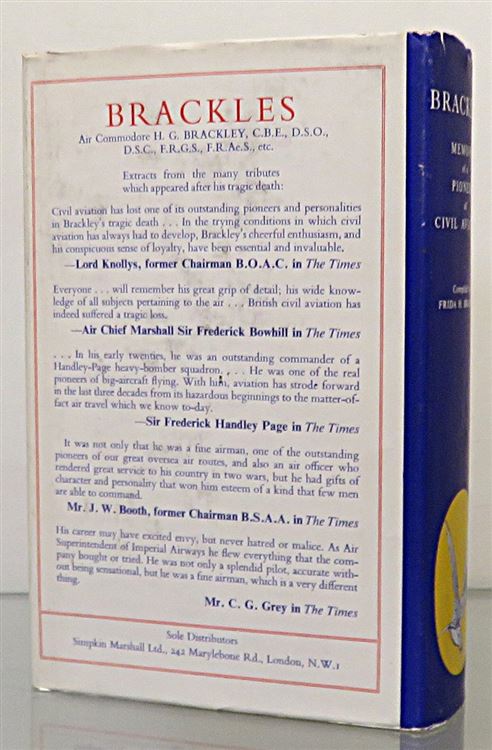 Hardback. First Edition. Signed by Frida H. Brackley to the title page with several signatures to the dedication page, unknown as to who they are. Complete with a dust jacket in good condition despite a little edge wear. Not price clipped. Underneath lie rich navy cloth boards with gilt insignia to the front. The boards show very little wear, however the spine has faded with some discolouration to the top and base. The pages within are toned although clean. pp. xv + 695. Overall a very good copy. The biography of Air Commodore Herbert George Brackley, compiled by his wife, shortly after his death in 1949.