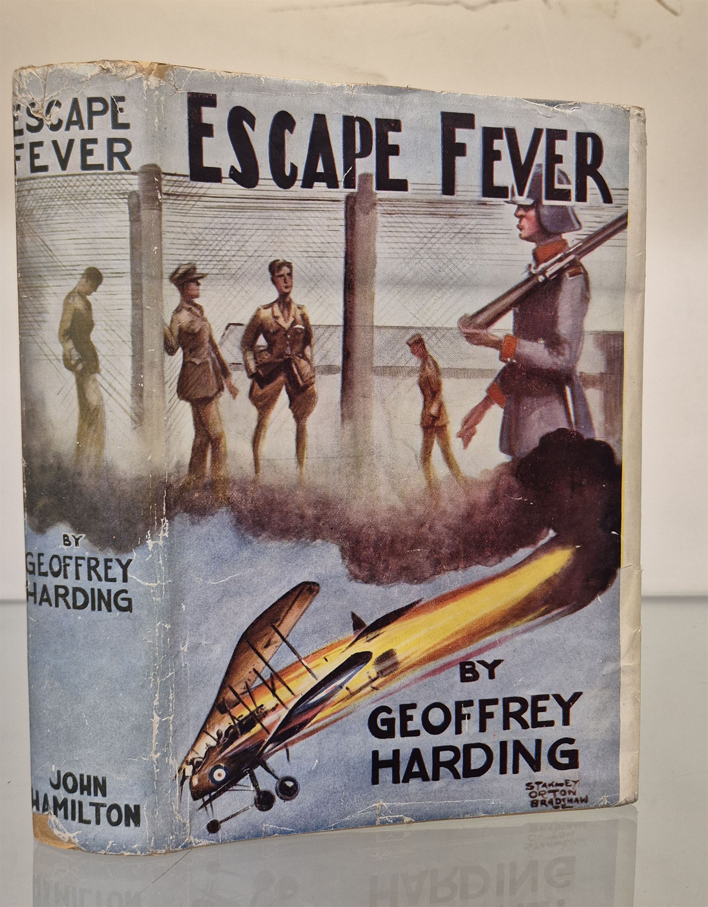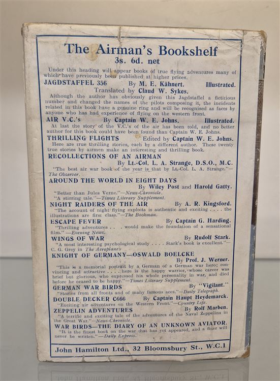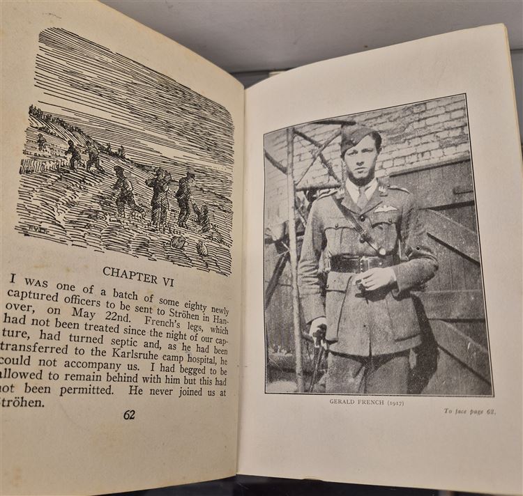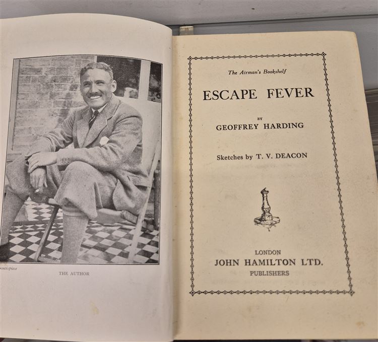Only about thirty British officers made succesful esacpes from German Prison camps during teh endtire period of the War. Geoffrey Harding, the fitteenth to get across the frontier to freedom, tells of his thrilling experiences fromt the time that he and his pilot were brought down in flames behind the German lines, until he reached England in company with his fellow esaper. 224 pp. with map to the rear, publishers catalogue dated 1935, Blue cloth boards with two inscriptons one dated 1935 the jacket is good overall. A rare copy in the original 1930's jacket.