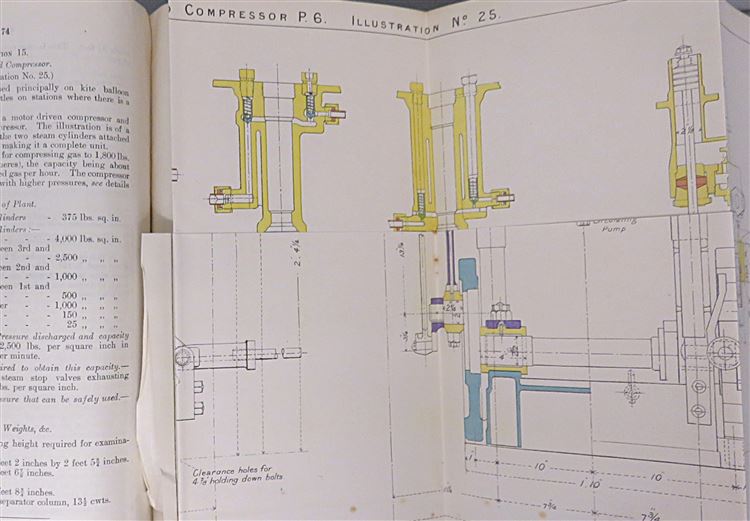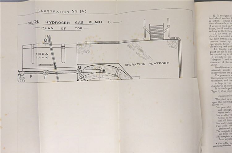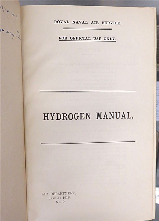 Hardback. Historical documentation of the Royal Naval Air Service during World War 1, functioning as the standard technical guide for the production, storage, and handling of hydrogen for airships, and kite balloons. This copy is bound in navy cloth with titles in white to the front and spine. Small neat ink inscription dated 1916 to the front free endpaper and hand written pen notation to the verso, headed "Cost of Production". Pen inscription dated 24/5/16 to the rear. Overall a very good copy with the binding in very good condition despite fading and creasing to the spine. There is slight foxing throughout, however the pages are generally very clean. pp. 113. Illustrated with many diagrams with some folding and a few coloured. A fascinating volume.