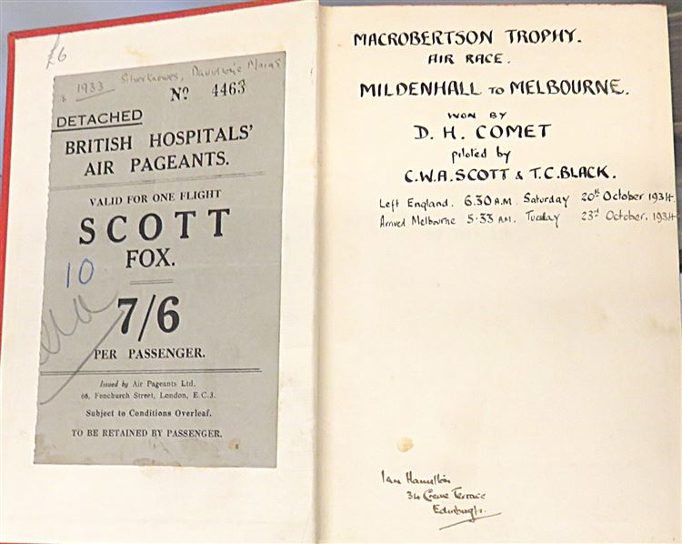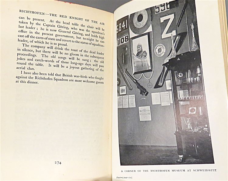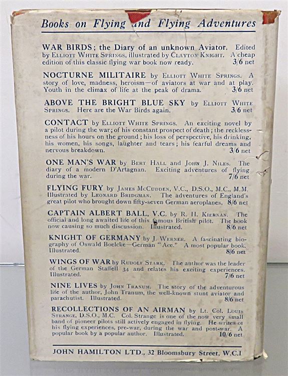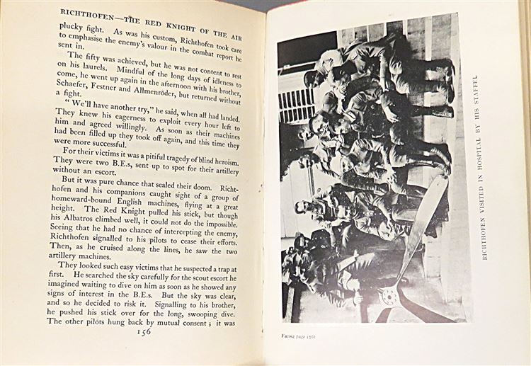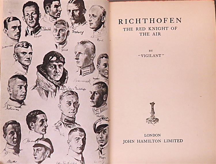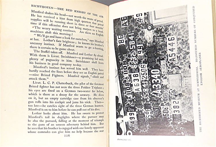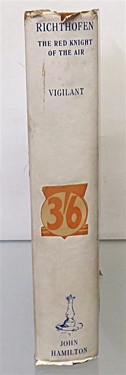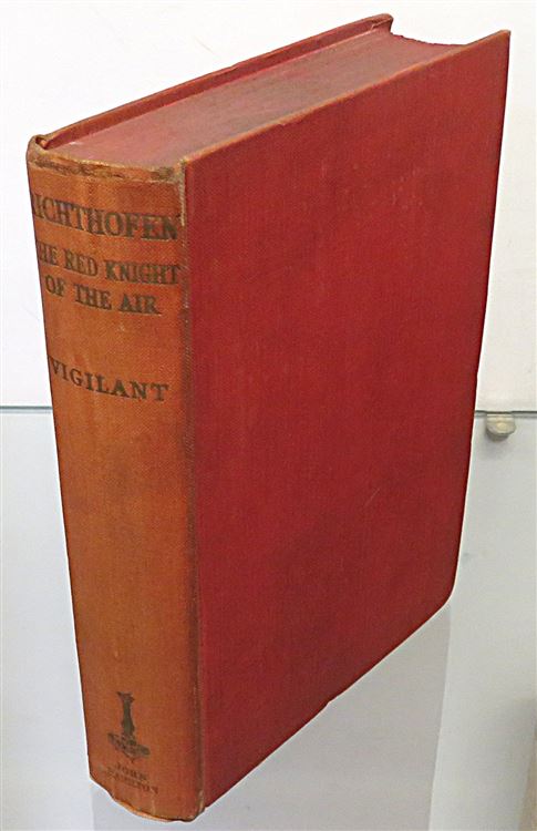 St Mary's Books is proud to present this stunning early edition of "Richthofen The Red Knight" by "Vigilant". Housed in its original pictoral dustjacket, featuring a stunning painting by Stanley Bradshaw of "The Red Knight" in flight, this hardback book is bound in crimson cloth with gold gilt lettering to the spine, and red top edge staining. Inside, one finds i-vii and 285 pages of text, peppered with contemporary black and white photographs, such as the frontispiece illustration of Richthofen. This book, and its dustjacket, have been remarkably well preserved, with few notable blemishes other than some minor tearing to the dustjacket, some offsetting to the back free endpapers, and fading to the cloth boards. On the front free endpapers, one finds a paste-down advertising the British Hospitals Air Pageant, across from an inscription detailing the winners of the Macrobertson Trophy Air Race - an exciting slice of history which only adds to the value of this copy. "Richthofen The Red Knight of the Air" is looking for a new home, and would make for the perfect gift for any aviation enthusiast or historian.