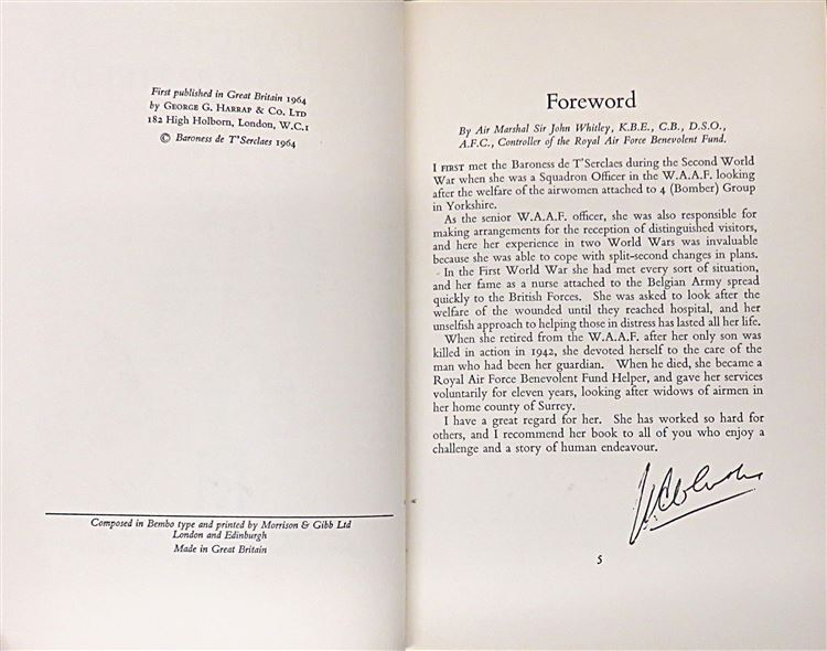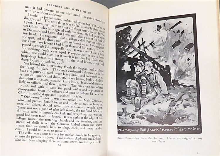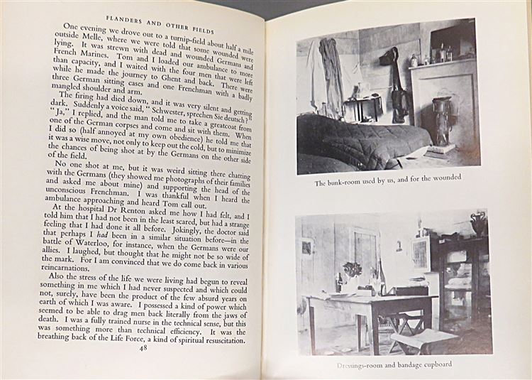 St Mary's Books is proud to present this 1964 first edition of "Flanders and Other Fields", signed by the author, The Baroness de T'Serclaes M. M.. Housed in its original dustjacket featuring a stunning original painting by Marc Henry Meunier presented to the Baroness in 1916, this hardback book is bound in blue cloth with a red title band and gold gilt lettering. Inside, one finds 221 pages of text, supplemented by lovely contemporary black and white photographs and other images, including the frontispiece, a charming sketch of the Baroness drawn by Matania. This book, which offers the memoirs of the remarkable life of the Baroness - a decorated WW1 British nurse, a member of the Women's R. A. F., and a talented motorcyclist. This copy is in very good condition with few notable blemishes other than that the spine and back of the dustjacket have yellowed and there is some minor offsetting to the back free endpaper. "Flanders and Other Fields" is looking for a new home, and would make for the perfect gift for any lover of memoirs filled with adventure.